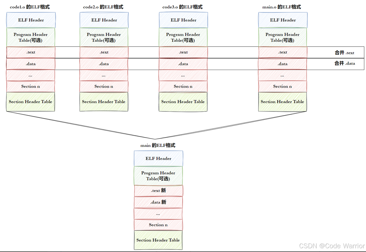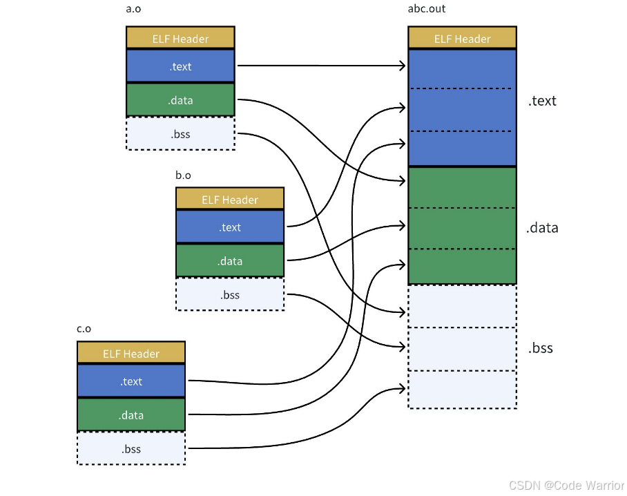 目标文件(可重定位 ELF),同时准备好所需的动静态库(同样属于 ELF 格式)。 - step-2:合并目标文件的节(Section)链接阶段会将多份