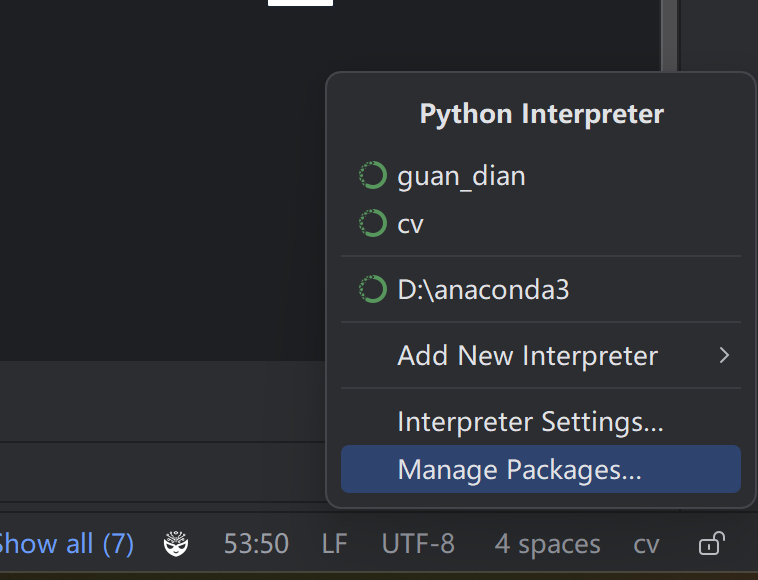 (1)打开解释器下面的解释器设置---然后点show all---删除掉之前配置的包