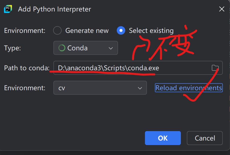 注意:Path to conda的conda.exe路径不变,然后重新加载环境文件扫描即可