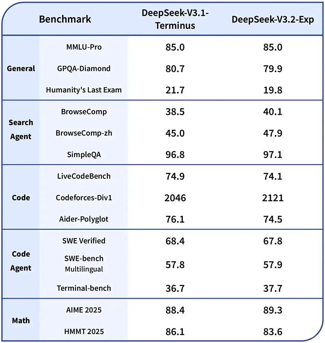 这一根本性的优化,使得模型在处理长文本时,推理速度提升了约2-3倍,内存使用降低了30-40%,同时保持了与前代模型V3.1-Terminus相当的性能水平。显著的效率提升也直接带来了应用成本的下降,其API调用价格降低了超过50%。