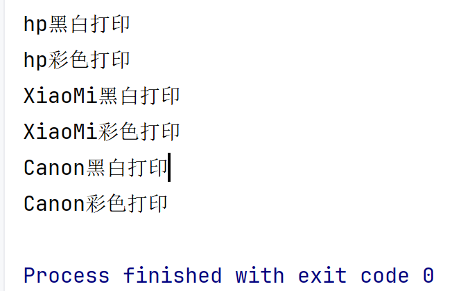class Hp(Printer):def Black_white_printing(self):print('hp黑白打印')def Color_Printing(self):print('hp彩色打印')class XiaoMi(Printer):def Black_white_printing(self):print('XiaoMi黑白打印')def Color_Printing(self):print('XiaoMi彩色打印')class Canon(Printer):def Black_white_printing(self):print('Canon黑白打印')def Color_Printing(self):print('Canon彩色打印')# 入围测试平台 make_test_printing(myobj:抽象类))