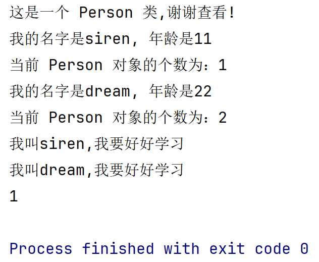 class Person:count = 0def __init__(self, name, age):self.name = nameself.age = agePerson.count += 1def __del__(self):Person.count -= 1# 定义一个方法,可以打印当前对象的个数;def get_count(self):return f"当前 Person 对象的个数为:{self.count}"# 定义一个方法show_info, 输出以下信息# 这是一个 Person 类,谢谢查看!@classmethoddef show_info(cls):print('这是一个 Person 类,谢谢查看!')# 打印对象的时候,可以输出打印自己的名字和年龄# 我的名字是 xxx, 年龄是 xxxdef __str__(self):return f'我的名字是{self.name}, 年龄是{self.age}'# 定义一个方法 study, 输出以下信息# 我叫 xxx, 我要好好学习def study(self):print(f'我叫{self.name},我要好好学习')# 操作步骤