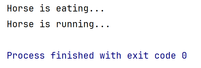 # 2.创建一个Horse(马)类继承于动物类,Horse类中重写run方法,增加打印输出"Horse is running...",同时实现eat方法, 输出 Horse is eating...