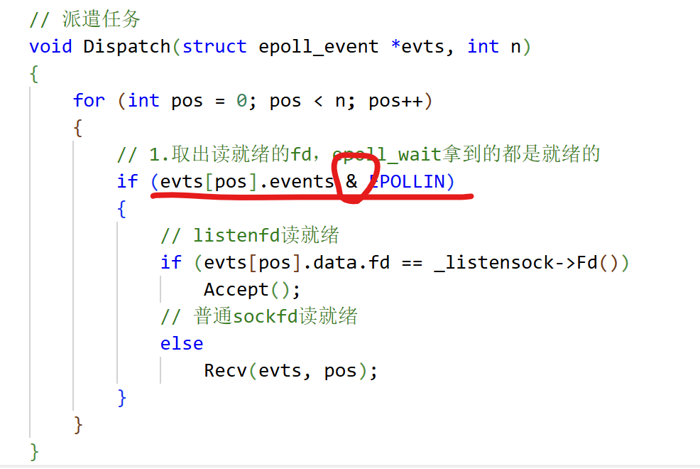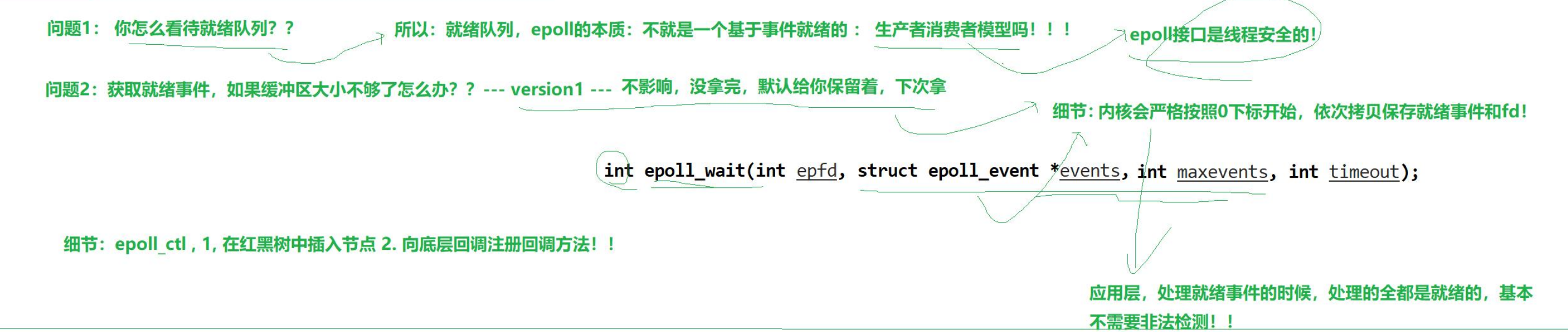 - 获取就绪事件,如果缓冲区大小不够了怎么办?--- 不影响,没拿完,默认给你保留着,下次拿 -> 细节:内核会严格按照0下标开始,依次拷贝保存就绪事件和fd -> 应用层处理就绪事件的时候,处理的全部是就绪的,不用轮询判断是否合法了
