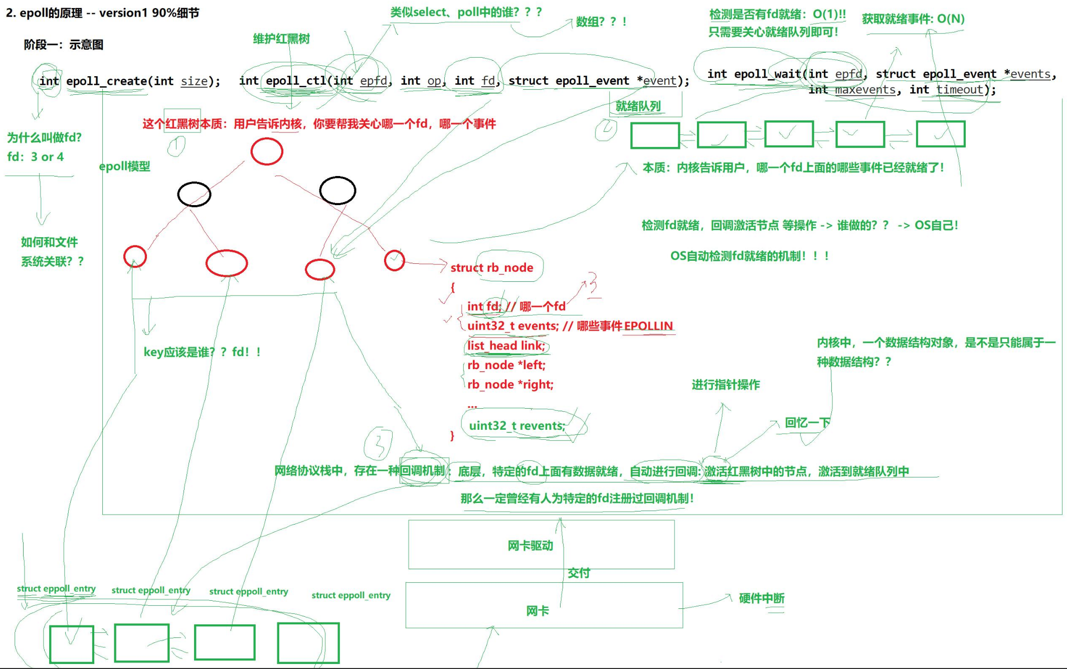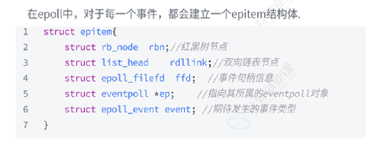 epoll_create -> 创建一个struct eventpoll(存放着红黑树、就绪队列)-> 对于每一个事件struct epitem(存放着其对应的 rb_node 和 就绪队列节点)-> 红黑树和就绪队列存的都是eptiem- epoll_ctl对于红黑树的增删改(用户拷贝到内核),本质:用户告诉内核,你要帮我关心哪个fd上的哪些事件
