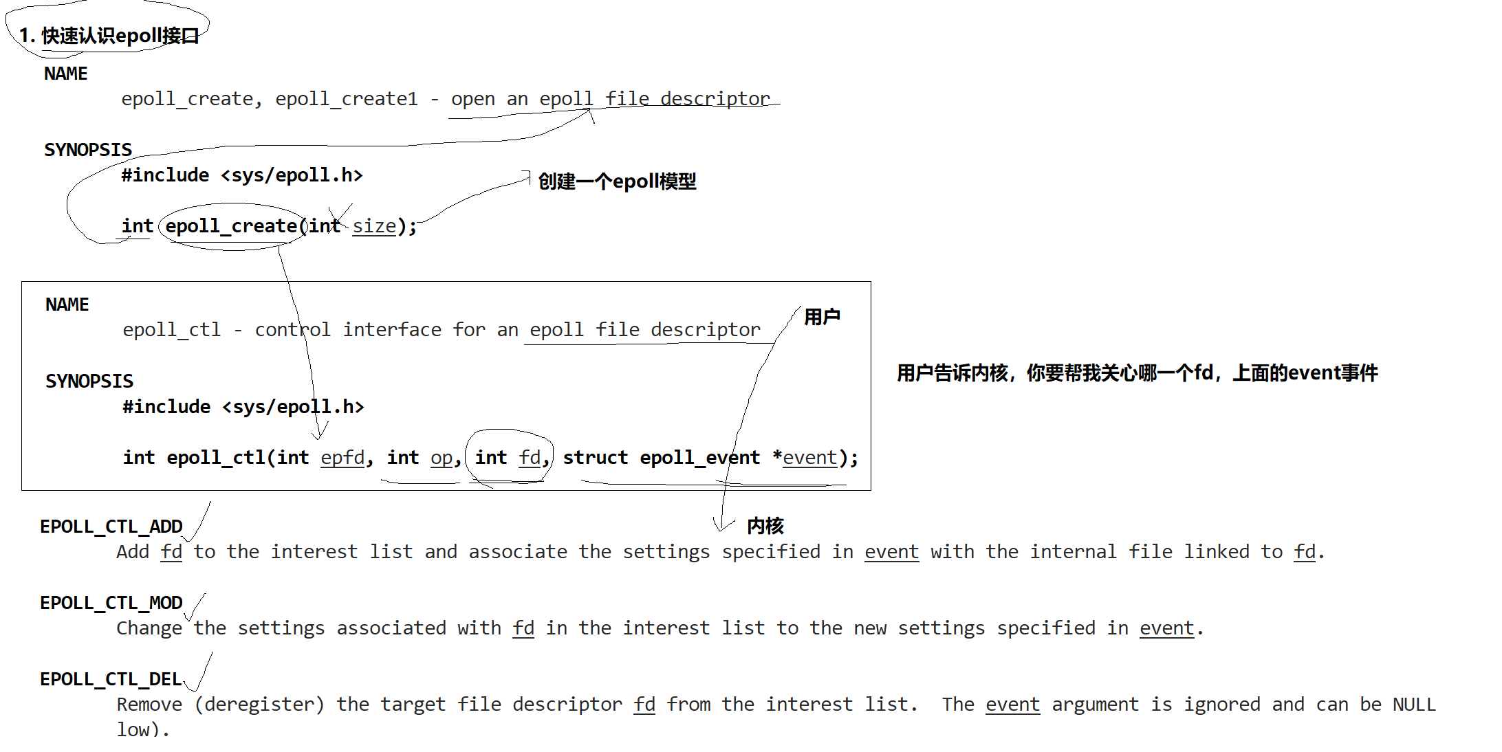 int epoll_ctl(int epfd, int op, int fd, struct epoll_event *_Nullable event); //用户告诉内核,你要帮我关心哪一个fd,上面的event事件