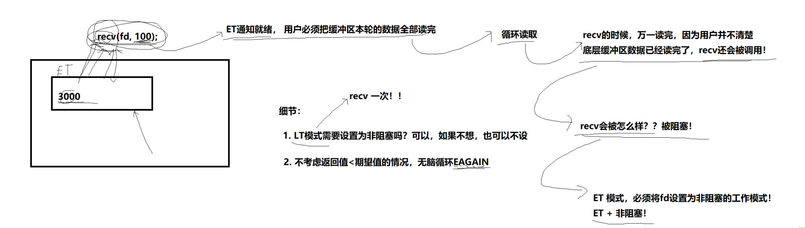 ET通知就绪,用户必须把缓冲区本轮数据全部读完 -> 循环读取 -> recv的时候,万一读完,用户并不清楚底层缓冲区已经被读完了,recv还会被调用(细节点:recv可以通过返回值来判断是否还有数据,返回值小于缓冲区大小,那么就表示本次读完。但是如果刚好,buff大小是本轮数据大小的约数,用阻塞调用读取完下一次读取会被阻塞)-> ET模式,必须把fd设置为非阻塞的工作模式(ET+fd)