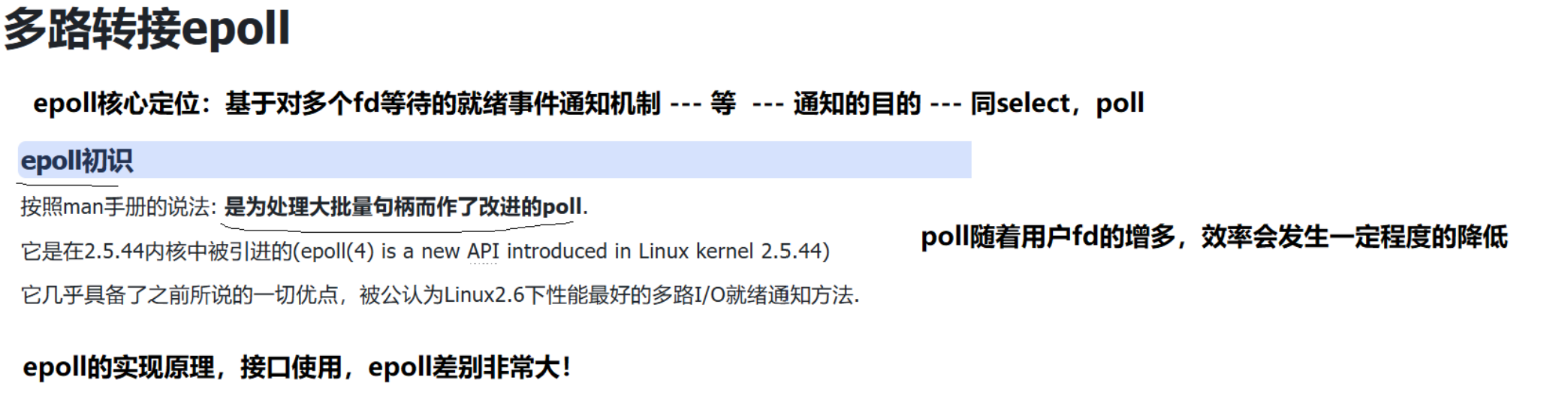 poll缺陷:poll随着用户fd的增多,效率会发生一定程度的降低epoll核心定位:基于多个fd等待的就绪事件通知机制 --- 等,同select,poll