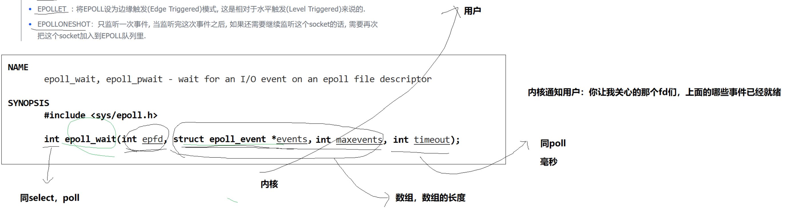 int epoll_wait(int epfd, struct epoll_event *events, int maxevents, int timeout); //内核通知用户:你让我关心的fd们,事件已经就绪(输出的就是已经就绪的,不需要轮询判断)