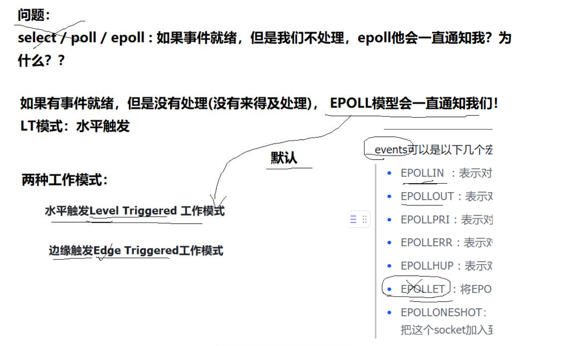 水平触发:有事件就绪,但没有处理(没有来得及处理),EPOLL模型会一直通知我们!