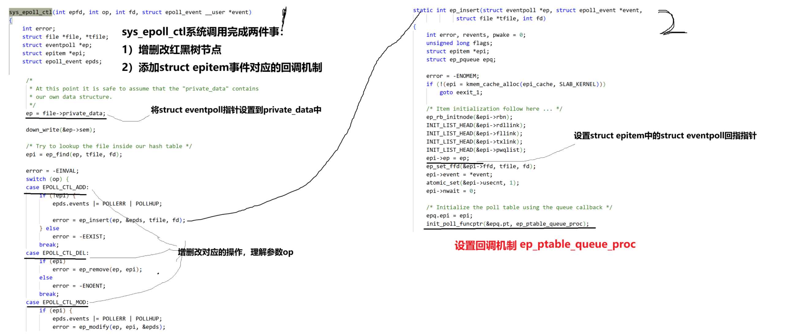 - epoll_ctl:1)在红黑树中插入节点 2)向底层回调注册回调方法