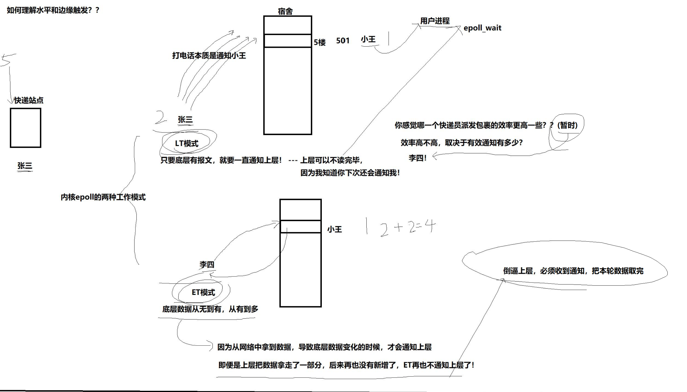 李四:ET模式,底层数据从无到有,从有到多(只通知一次)-> 因为从网络中拿到数据,导致底层数据变化时,才会通知上层 -> 即便上层没读完,也不通知 -> 倒逼上层,必须收到通知,把本轮数据取完。