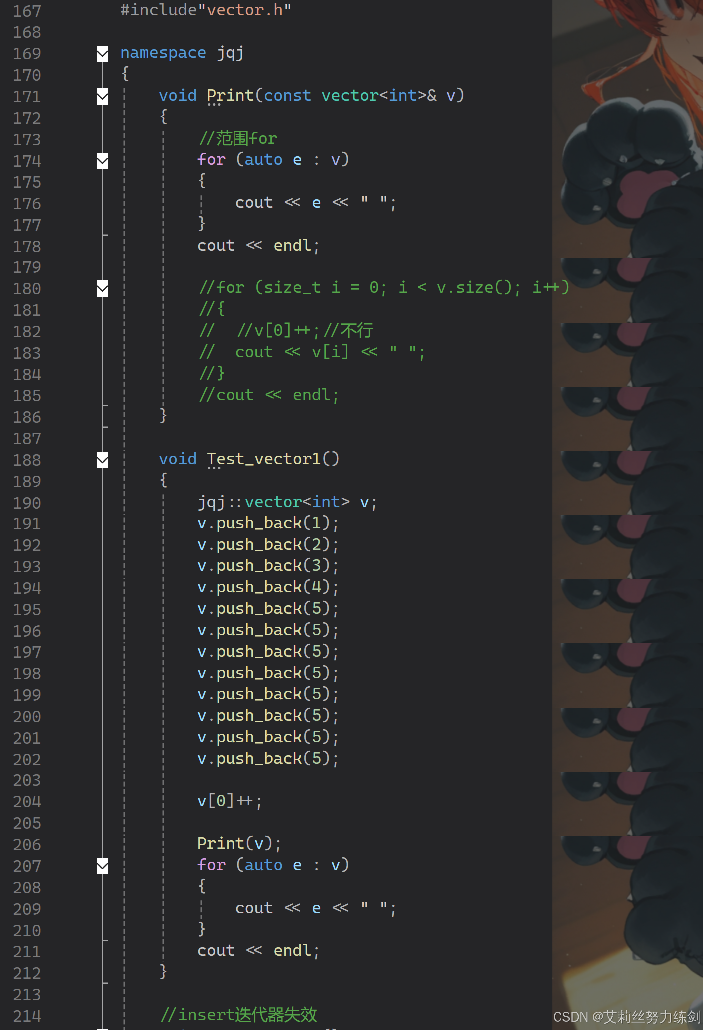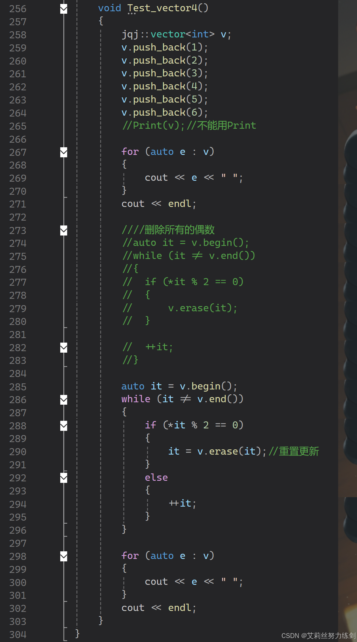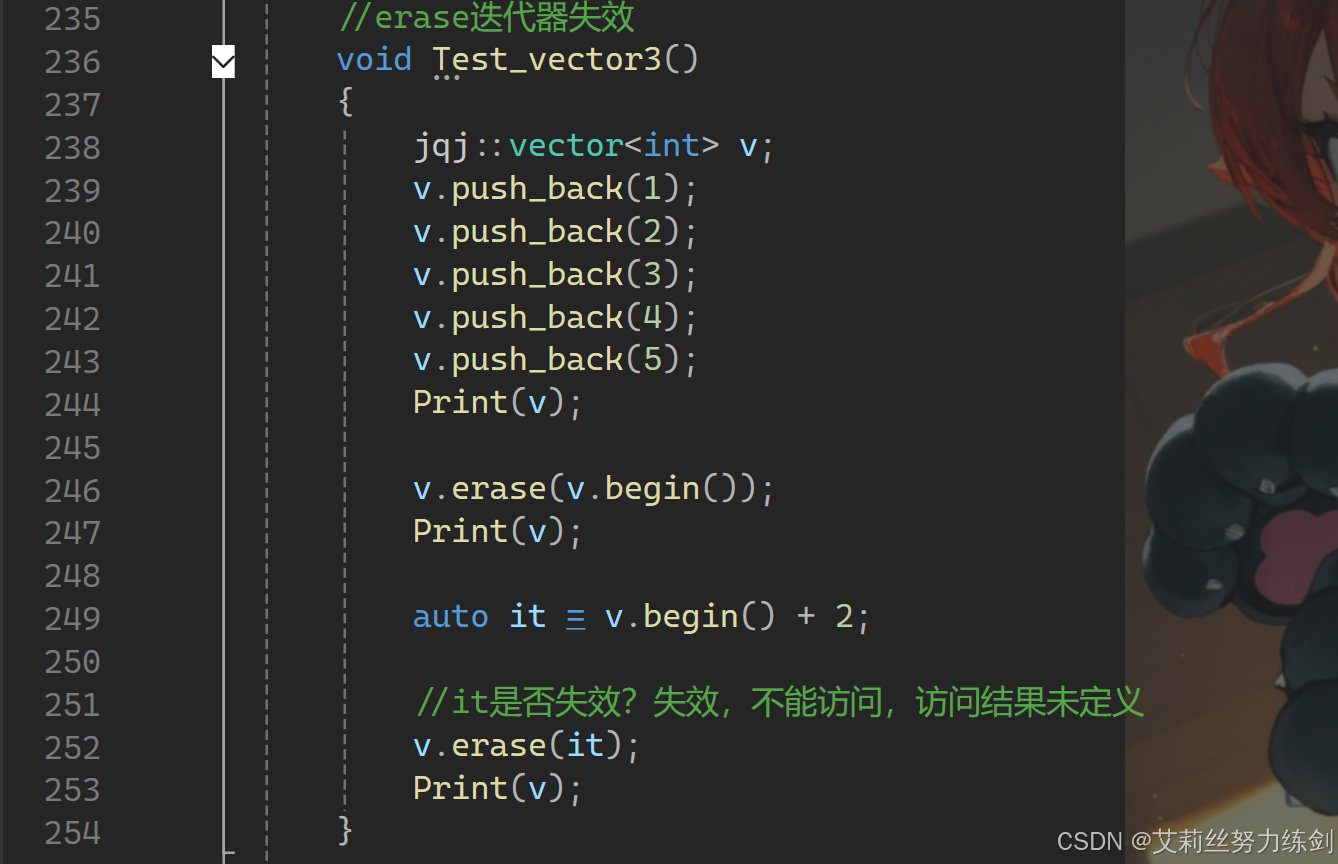 {void Print(const vector<int>& v){//范围forfor (auto e : v){cout << e << " ";}cout << endl;//for (size_t i = 0; i < v.size(); i++)//{// //v[0]++;//不行// cout << v[i] << " ";//}//cout << endl;}void Test_vector1(){jqj::vector<int> v;v.push_back(1);v.push_back(2);v.push_back(3);v.push_back(4);v.push_back(5);v.push_back(5);v.push_back(5);v.push_back(5);v.push_back(5);v.push_back(5);v.push_back(5);v.push_back(5);v[0]++;Print(v);for (auto e : v){cout << e << " ";}cout << endl;}//insert迭代器失效void Test_vector2(){jqj::vector<int> v;v.push_back(1);v.push_back(2);v.push_back(3);v.push_back(4);//v.push_back(5);Print(v);v.insert(v.begin(), 0);Print(v);auto it = v.begin() + 3;//第4个位置//insert以后,it是否失效?//it失效了,也就意味着,insert以后,it失效了,it就不能使用了v.insert(it, 30);Print(v);}//erase迭代器失效void Test_vector3(){jqj::vector<int> v;v.push_back(1);v.push_back(2);v.push_back(3);v.push_back(4);v.push_back(5);Print(v);v.erase(v.begin());Print(v);auto it = v.begin() + 2;//it是否失效?失效,不能访问,访问结果未定义v.erase(it);Print(v);}void Test_vector4(){jqj::vector<int> v;v.push_back(1);v.push_back(2);v.push_back(3);v.push_back(4);v.push_back(5);v.push_back(6);//Print(v);//不能用Printfor (auto e : v){cout << e << " ";}cout << endl;////删除所有的偶数//auto it = v.begin();//while (it != v.end())//{// if (*it % 2 == 0)// {// v.erase(it);// }// ++it;//}auto it = v.begin();while (it != v.end()){if (*it % 2 == 0){it = v.erase(it);//重置更新}else{++it;}}for (auto e : v){cout << e << " ";}cout << endl;}
