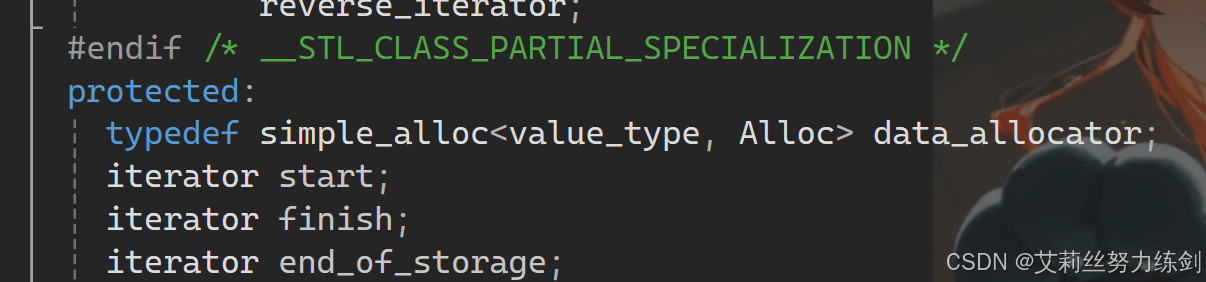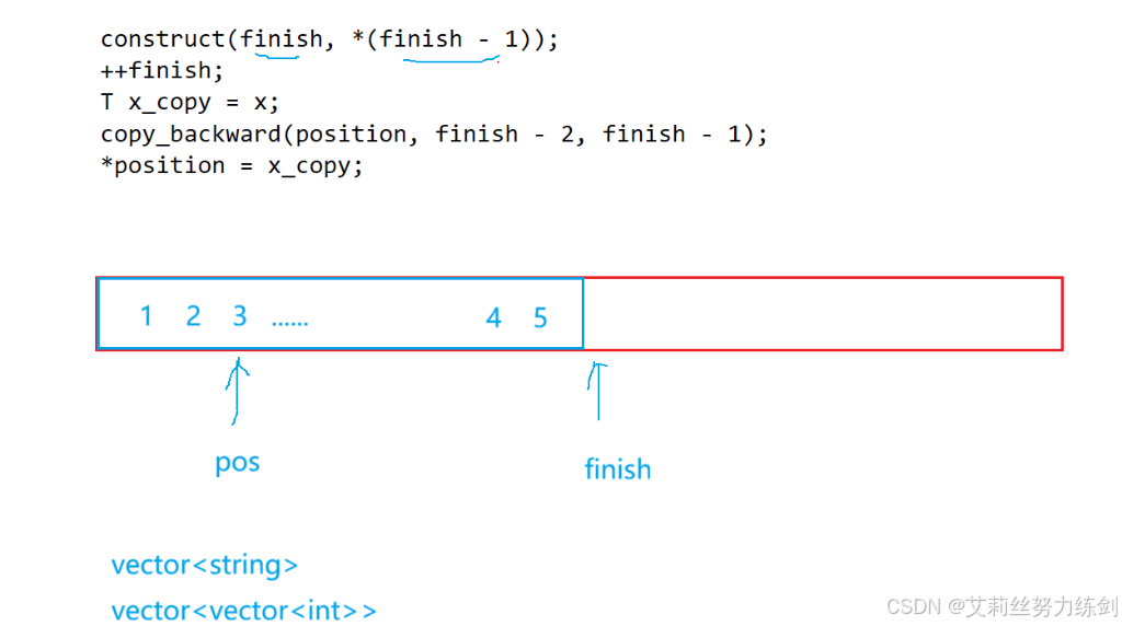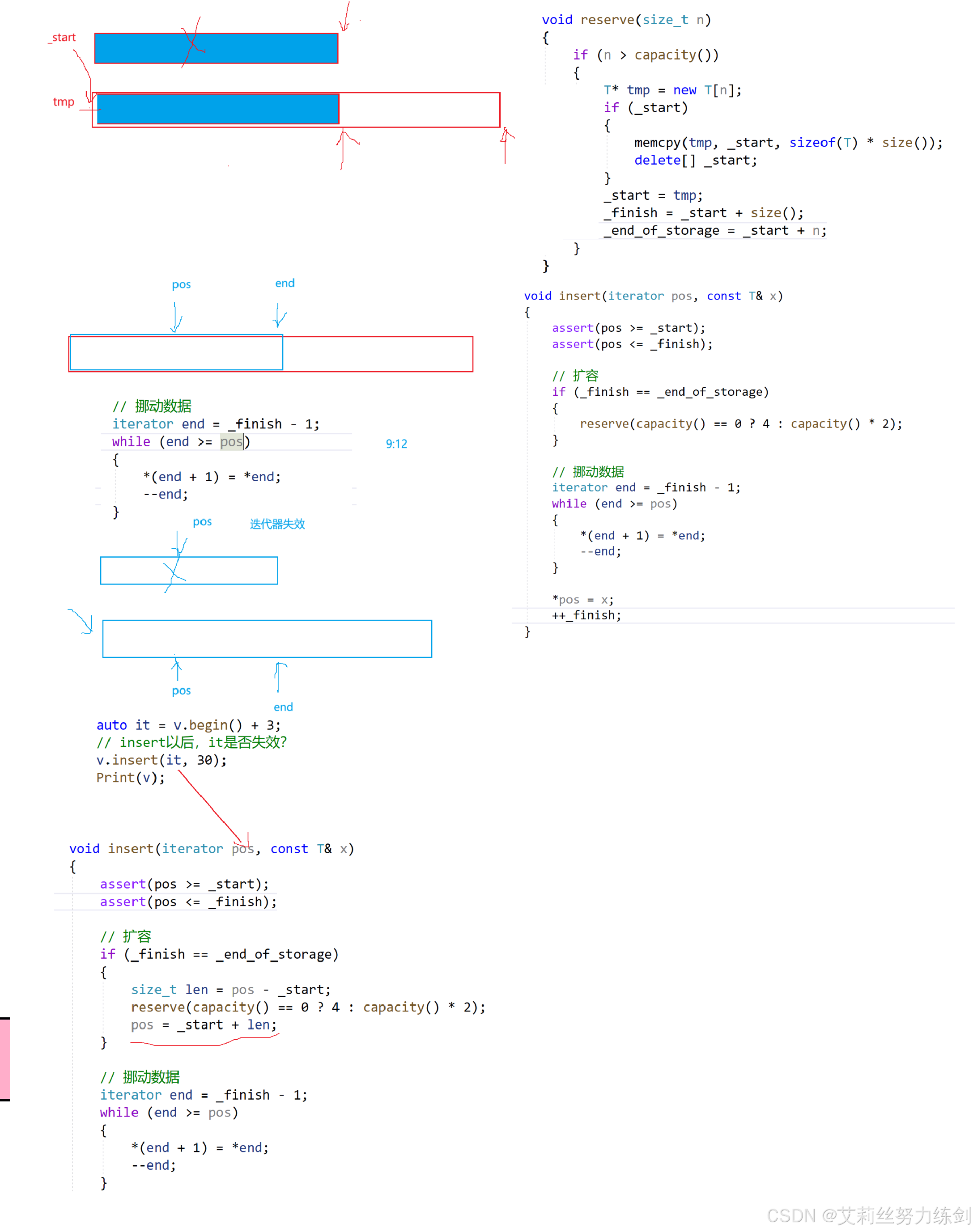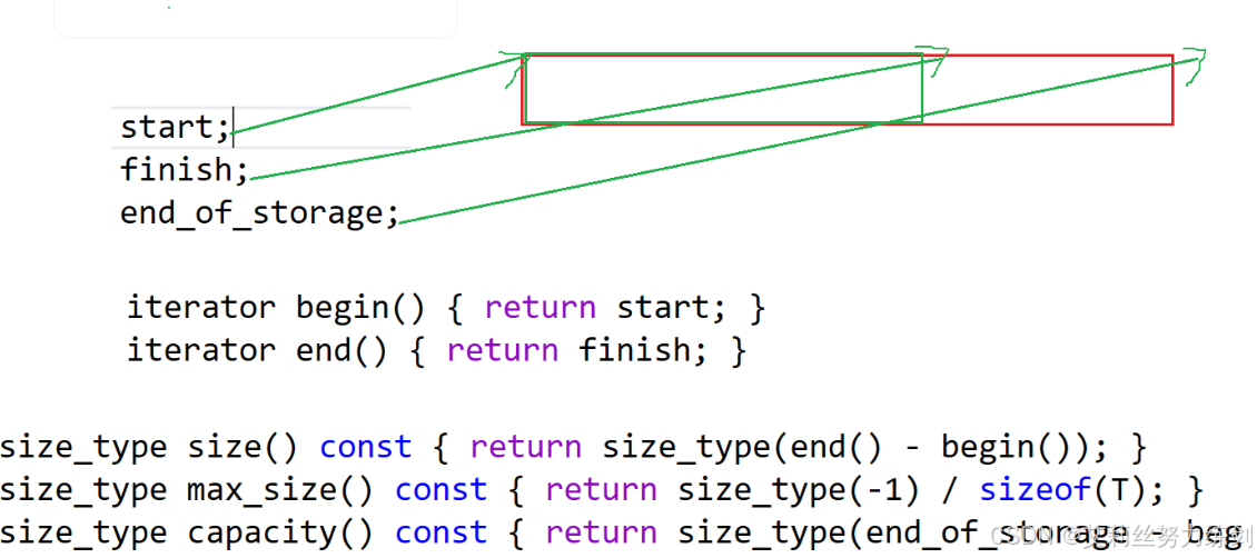 {template<class T>class vector{public:/*typedef T* iterator;*/using iterator = T*;using const_iterator = const T*;//using这里是复用了展开命名空间的关键词,关键词复用在C++很常见//迭代器iterator begin(){return _start;}//迭代器iterator end(){return _finish;}//const修饰的情况const_iterator begin() const{return _start;}//const修饰的情况const_iterator end() const{return _finish;}//构造vector():_start(nullptr),_finish(nullptr),_end_of_storqge(nullptr){ }//析构~vector(){if (_start){delete[] _start;_start = _finish = _end_of_storge = nullptr;}}//boolbool empty() const{return _start == _finish;}//扩容void reserve(size_t n){if (n > capacity())//这里是调用capacity的函数{size_t sz = size();//记录size的值T* tmp = new T[n];if (_start){memcpy(tmp, _start, sizeof(T) * sz);delete[] _start;}_start = tmp;_finish = _start + sz;//这里加size会出问题_end_of_storqge = _start + n;}}//容量size_t capacity() const{return _end_of_storge - _start;}//有效长度size_t size() const{return _finish - _start;}T& operator[](size_t i){assert(i < size());return _start[i];}const T& operator[](size_t i) const{assert(i < size());return _start[i];}void push_back(const T& x){if (_finish == _end_of_storge){reserve(capacity() == 0 ? 4 : capacity() * 2);//扩两倍}*_finish = x;++_finish;}void pop_back(){assert(!empty());//判空--_finish;}iterator insert(iterator pos, const T& x){assert(pos >= _start);assert(pos <= _finish);if (_finish == _end_of_storage){size_t len = pos - _start;reserve(capacity() == 0 ? 4 : capacity() * 2);pos = _start + len;}iterator end = _finish - 1;while (end >= pos){*(end + 1) = *end;--end;}//如果是malloc,这里就不能这么写了*pos = x;++_finish;return pos;}iterator erase(iterator pos){assert(pos >= _start);assert(pos < _finish);iterator it = pos + 1;while (it != _finish){*(it - 1) = *it;++it;}--_finish;return pos;}private:iterator _start;iterator _finish;iterator _end_of_storage;};