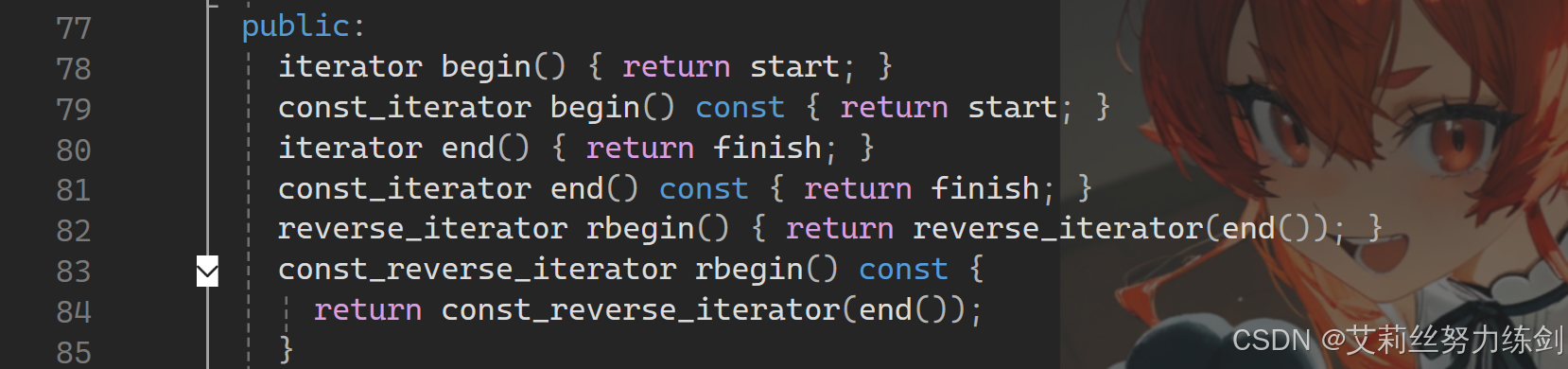 {vector<int> v{ 1,2,3,4,5,6 };auto it = v.begin();// 将有效元素个数增加到100个,多出的位置使用8填充,操作期间底层会扩容// v.resize(100, 8);// reserve的作用就是改变扩容大小但不改变有效元素个数,操作期间可能会引起底层容量改变// v.reserve(100);// 插入元素期间,可能会引起扩容,而导致原空间被释放// v.insert(v.begin(), 0);// v.push_back(8);// 给vector重新赋值,可能会引起底层容量改变v.assign(100, 8);/*出错原因:以上操作,都有可能会导致vector扩容,也就是说vector底层原理旧空间被释放掉,而在打印时,it还使用的是释放之间的旧空间,在对it迭代器操作时,实际操作的是一块已经被释放的空间,而引起代码运行时崩溃。解决方式:在以上操作完成之后,如果想要继续通过迭代器操作vector中的元素,只需给it重新赋值即可。*/while (it != v.end()){cout << *it << " ";++it;}cout << endl;return 0;