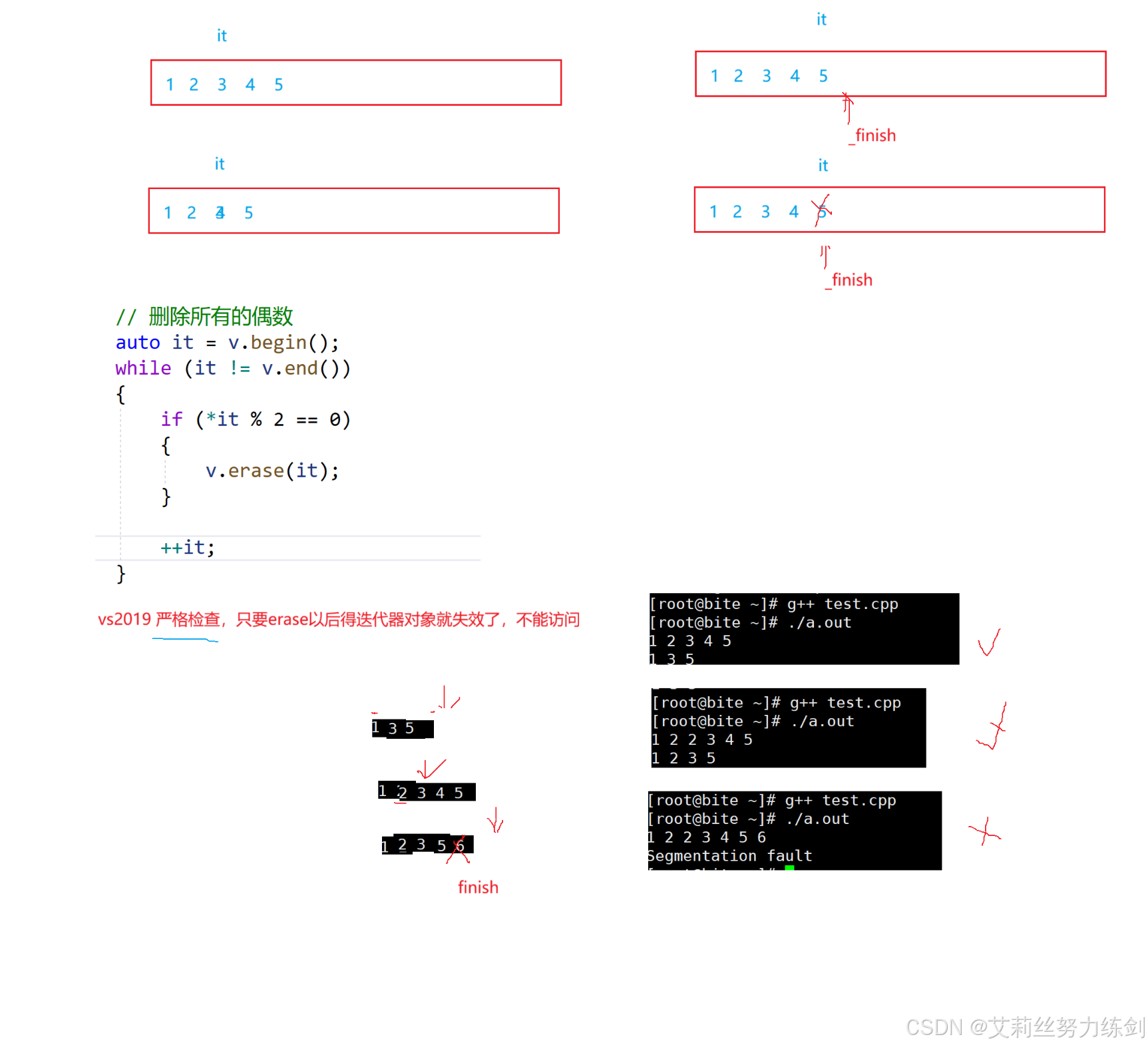 erase删除pos位置元素后,pos位置之后的元素会往前搬移,没有导致底层空间的改变,理 论上讲迭代器不应该会失效,但是:如果pos刚好是最后一个元素,删完之后pos刚好是end 的位置,而end位置是没有元素的,那么pos就失效了。因此删除vector中任意位置上元素 时,vs就认为该位置迭代器失效了。 以下代码的功能是删除vector中所有的偶数,请问那个代码是正确的,为什么?