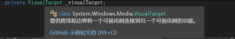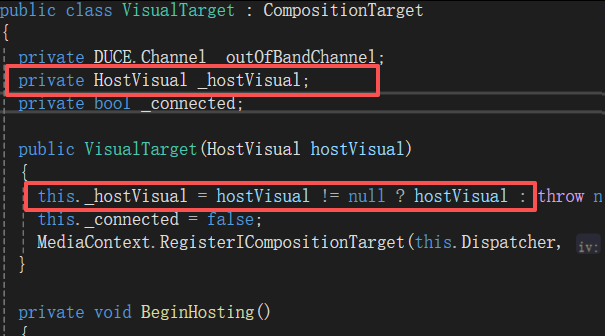 上述控件的_hostVisual 字段属于主线程(UI 线程)的可视化树上,创建_visualTarget实例,把【DispatcherContainer 的_hostVisual 字段】赋值给【_visualTarget私有的_hostVisual字段】;