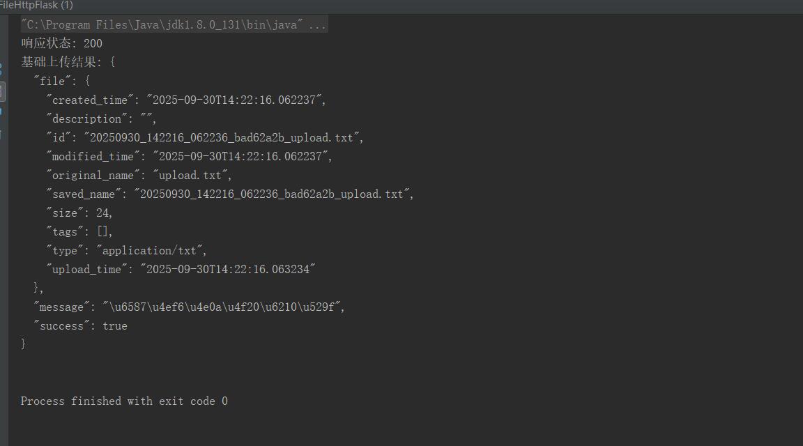 public class FileHttpFlask {public static void main(String[] args) {try {// 示例1: 基础文件上传String urlSingle = "http://127.0.0.1:5000/api/upload";File file = new File("E:\\testWorkPlace\\testrun\\src\\HttpFlask\\upload.txt");String result = HttpClient4514FileUpload.uploadFile(urlSingle, file);System.out.println("基础上传结果: " + result);} catch (IOException e) {e.printStackTrace();}}