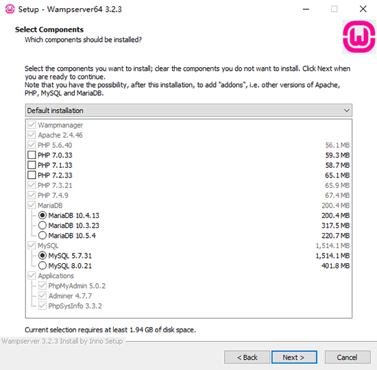6) 选择需要安装的组件。根据需要,选择下 MariaDB 和 MySQL 的版本,如果还需要 PHP7.0 / 7.1 / 7.2 也可以勾选上。选择好之后,点下一步(Next)继续安装。