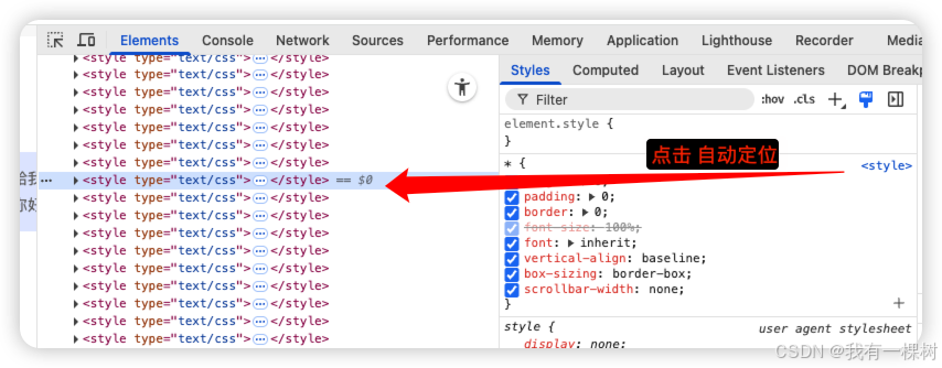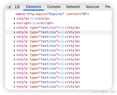 就 css 来说,在一个 vue+vite的项目中,在vite.config.ts 中如果你不配置 sourceMap相关的配置,在开发环境,组件内的样式,会被打包成内联的 style 标签放在 index.html 的头部,如下图所示: