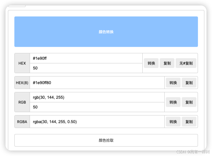 虽然有很多转换颜色的网站,但是都多多少少缺点东西。所以我自己搞了一个颜色转换工具,涵盖了十六进制各种透明度到 rgb / rgba 各种透明度的转换,如下图