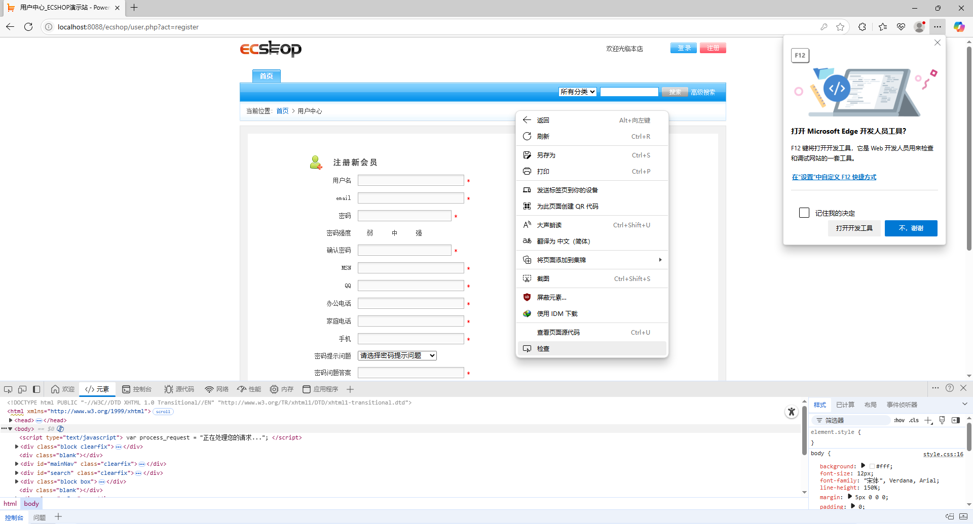 3、 在登录页单击‘注册’或者‘立即注册’按钮,进入注册新会员页面,打开开发者工具;