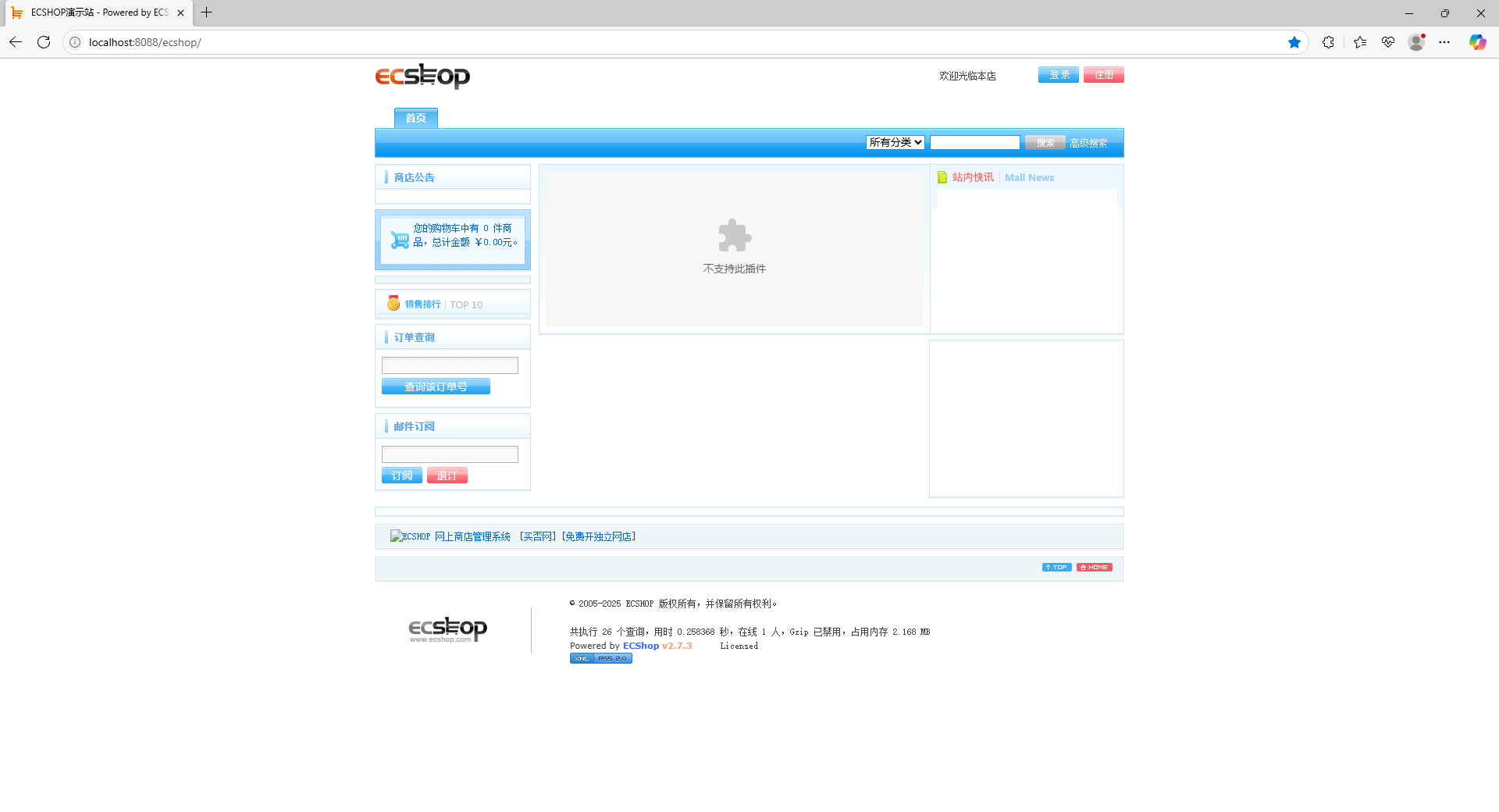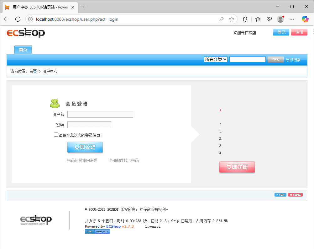 2、成功启动 apache 和 MySQL 服务后,打开开源电商商城系统首页,单击‘登录’按钮,打开登录页面;