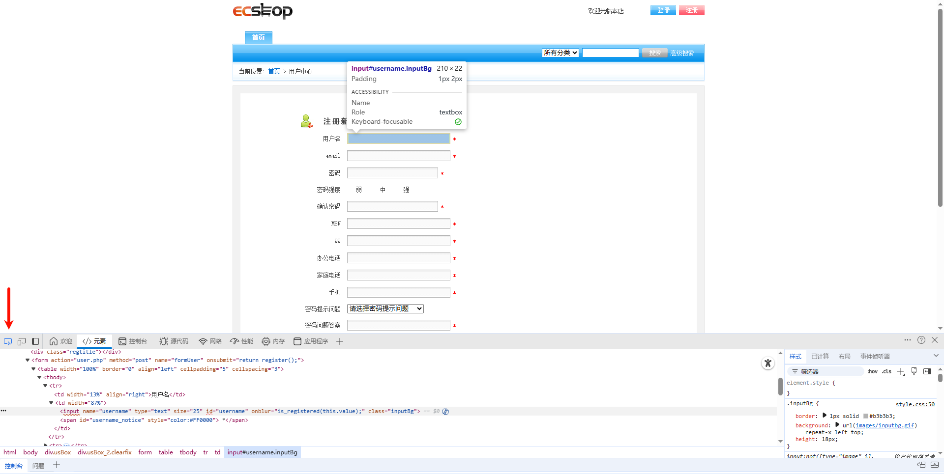 4、鼠标单击开发者工具中的元素定位按钮,鼠标光标悬停在‘用户名’标签后的文本输入框上;(未单击选中时是置灰色的,点击选中后呈蓝色;下图红色箭头指示,最左侧的一个按钮,这里仅供参考,若有区别请自行解决;)
