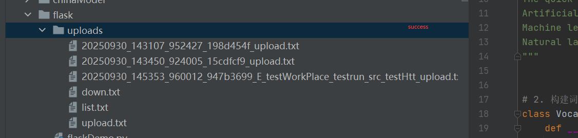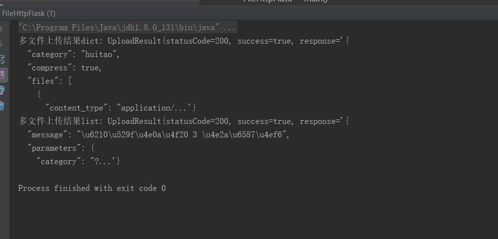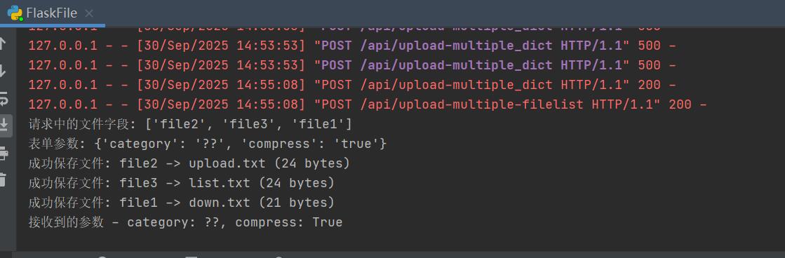 import java.util.Map;public class FileHttpFlask {public static void main(String[] args) {try {// 示例4: 多文件上传,flask字典接受Map<String, File> files = new HashMap<>();files.put("file1", new File("E:\\testWorkPlace\\testrun\\src\\testHtt\\down.txt"));files.put("file2", new File("E:\\testWorkPlace\\testrun\\src\\testHtt\\upload.txt"));Map<String, String> parameH = new HashMap<>();parameH.put("category", "huitao");parameH.put("compress", "true");String urlMore="http://127.0.0.1:5000/api/upload-multiple_dict";FileUploader4514.UploadResult multiResult =FileUploader4514.uploadMultiple(urlMore, files, parameH);System.out.println("多文件上传结果dict: " + multiResult);// 示例4: 多文件上传,flask列表接受// 使用不同的字段名(Map的键)Map<String, File> filess = new HashMap<>();String urlList="http://127.0.0.1:5000/api/upload-multiple-filelist";filess.put("file1", new File("E:\\testWorkPlace\\testrun\\src\\testHtt\\down.txt"));filess.put("file2", new File("E:\\testWorkPlace\\testrun\\src\\testHtt\\upload.txt"));filess.put("file3", new File("E:\\testWorkPlace\\testrun\\src\\testHtt\\list.txt"));FileUploader4514.UploadResult multilist = FileUploader4514.uploadFilesWithMap(urlList,filess);System.out.println("多文件上传结果list: " + multilist);} catch (IOException e) {e.printStackTrace();}}