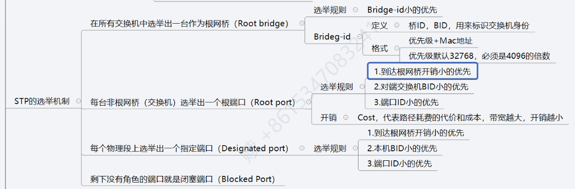根端口选举:到达根网桥开销最小的优先,对端交换机的BID小的优先,端口ID小的优先。