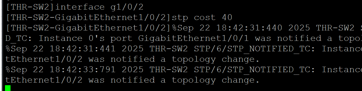 在sw2上给接口2配置40开销,使其sw1和sw2到sw4的开销一样,默认开销为20