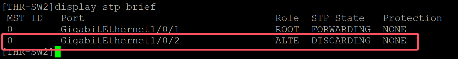 在SW2上查看接口状态,发现G1/0/2已经变成新的闭塞端口