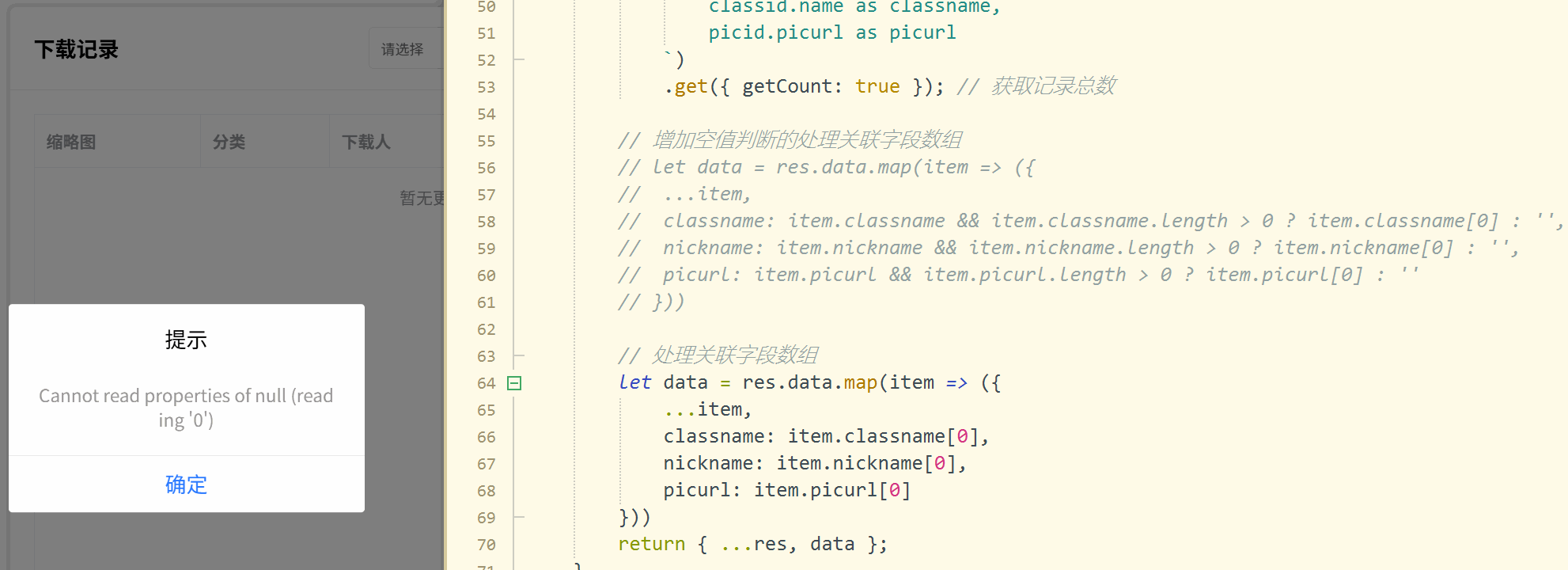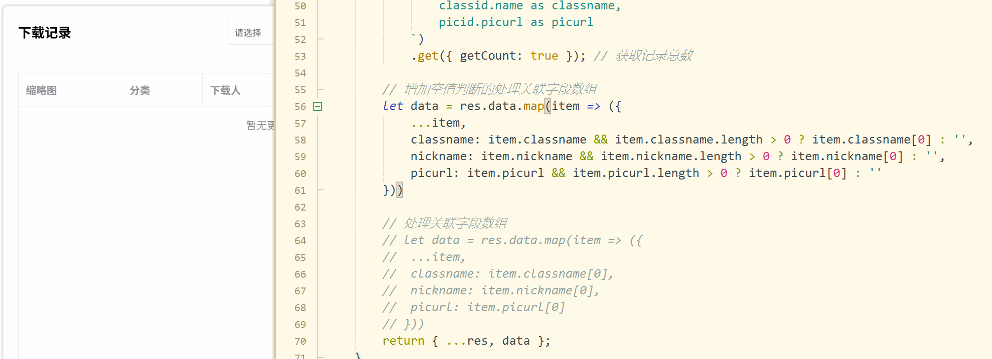 // 增加空值判断的处理关联字段数组let data = res.data.map(item => ({...item,classname: item.classname && item.classname.length > 0 ? item.classname[0] : '',nickname: item.nickname && item.nickname.length > 0 ? item.nickname[0] : '',picurl: item.picurl && item.picurl.length > 0 ? item.picurl[0] : ''}))