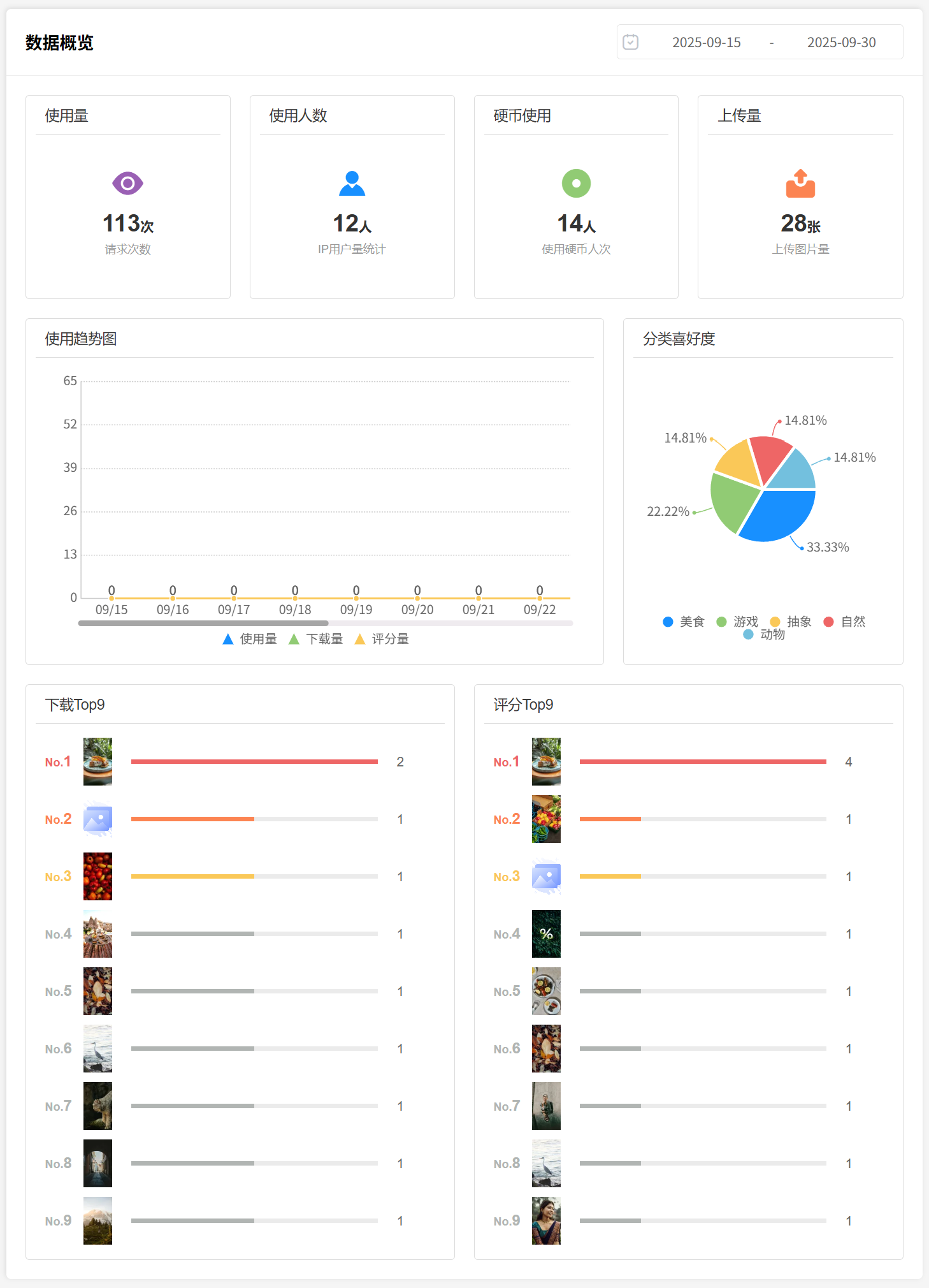 async rankOrder({ type = null, dataRange = [], number = 9 } = {}) {// 确保number不超过15number = Math.min(number, 15);// 根据type确定要查询的数据表// 如果type是'download',则查询'wallpaper-download'表// 如果type是'score',则查询'wallpaper-score'表// 否则,table为空字符串let table = type == 'download' ? 'wallpaper-download' : type == 'score' ? 'wallpaper-score' : '';// 如果table为空,则输出错误信息并返回空数组if (!table) {console.error('无效的类型参数:', type);return [];}// 构建时间范围查询条件let wre = dataRange.length ?`createTime >= ${dayjs(dataRange[0]).startOf("day").valueOf()} && createTime<=${dayjs(dataRange[1]).endOf("day").valueOf()}` : {};const dbJQL = uniCloud.databaseForJQL({clientInfo: this.getClientInfo()});try {// 优先使用分组统计let { data: groupData = [] } = await dbJQL.collection(table).where(wre).groupBy("picid").groupField("count(*) as countTotal").orderBy("countTotal desc").limit(number).get();if (groupData.length === 0) {// 如果分组统计无结果,使用手动统计let { data: allRecords = [] } = await dbJQL.collection(table).where(wre).field("picid").get();// 手动统计每个picid的出现次数let countMap = {};allRecords.forEach(record => {if (record.picid) {countMap[record.picid] = (countMap[record.picid] || 0) + 1;}});// 转换为数组并排序groupData = Object.keys(countMap).map(picid => ({picid,countTotal: countMap[picid]})).sort((a, b) => b.countTotal - a.countTotal).slice(0, number);}if (groupData.length === 0) return [];// 获取壁纸详情// 使用groupData数组生成picid数组,并过滤掉空值let picidArr = groupData.map(item => item.picid) // 使用map方法提取每个元素的picid属性.filter(Boolean); // 使用filter方法过滤掉所有假值(null、undefined、0、false、NaN、空字符串)let { data: piclist = [] } = await dbJQL.collection("wallpaper-piclist").where(`_id in ${JSON.stringify(picidArr)}`).field("_id,picurl").get();// 合并数据return groupData.map(item => {let pic = piclist.find(p => p._id === item.picid);return {picid: item.picid,countTotal: Number(item.countTotal) || 0,picurl: pic?.picurl || ''};});} catch (error) {console.error('Failed to get rank data:', error);return [];}},