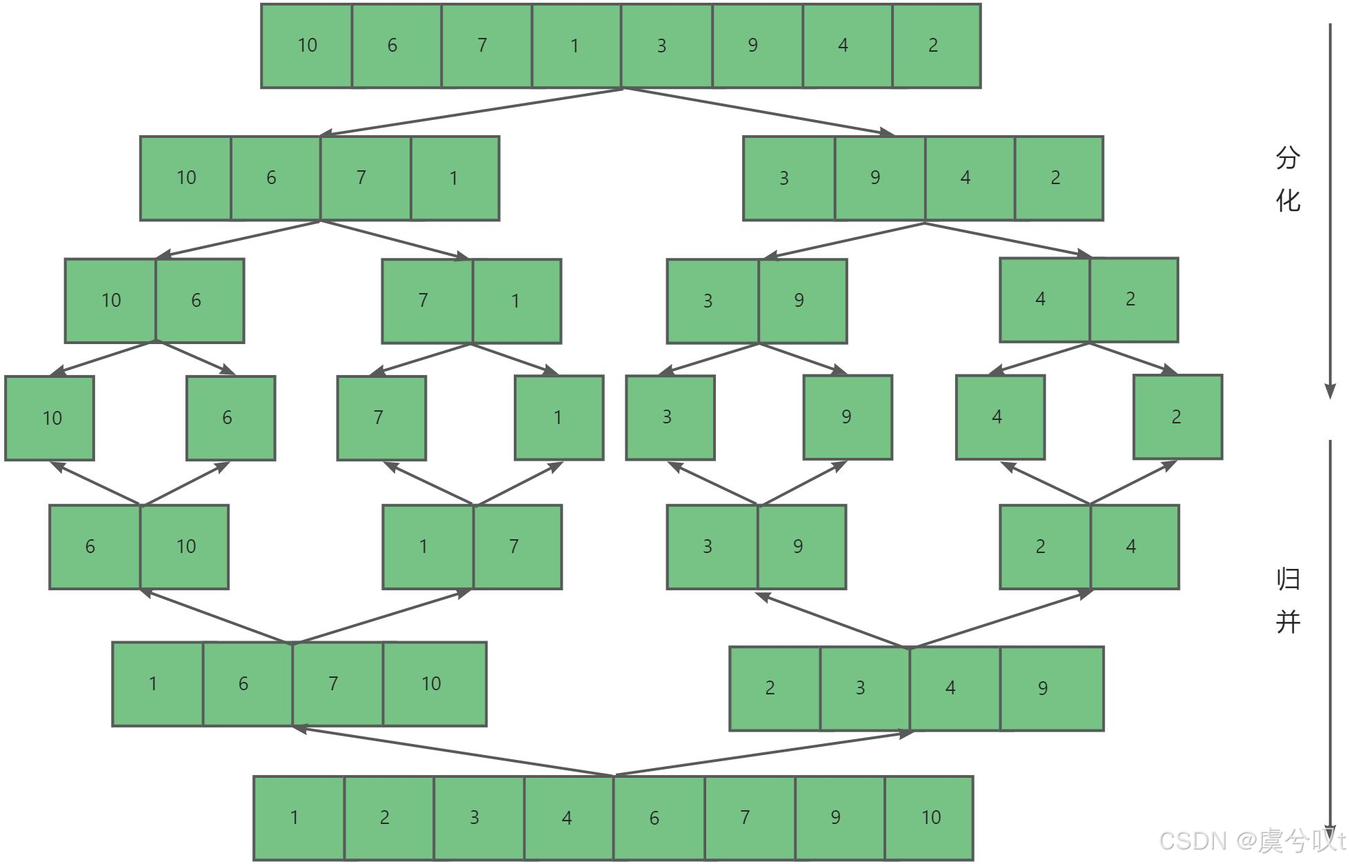 {if (begin >= end)return;int mid = (begin + end) >> 1;_MergeSort(arr, begin, mid, tmp);//归并左区间_MergeSort(arr, mid+1, end, tmp);//归并右区间int i = begin; int begin1 = begin, end1 = mid;int begin2 = mid + 1, end2 = end;while (begin1 <= end1 && begin2 <= end2){if (arr[begin1] < arr[begin2]){tmp[i++] = arr[begin1++];}else{tmp[i++] = arr[begin2++];}}//若是还有区间存在数据while (begin1 <= end1){tmp[i++] = arr[begin1++];}while (begin2 <= end2){tmp[i++] = arr[begin2++];}//最后将归并完后后的数据拷贝回原数组memcpy(arr + begin, tmp + begin, sizeof(int) * (end - begin + 1));