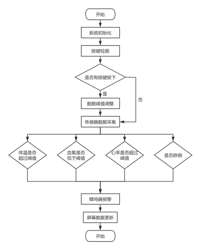{body_temp = DS18B20_Get_Temp(); //获取DS18B20体温数据Get_Max30102_Data(); //获取心率血氧数据FallDetection(); //摔倒检测}