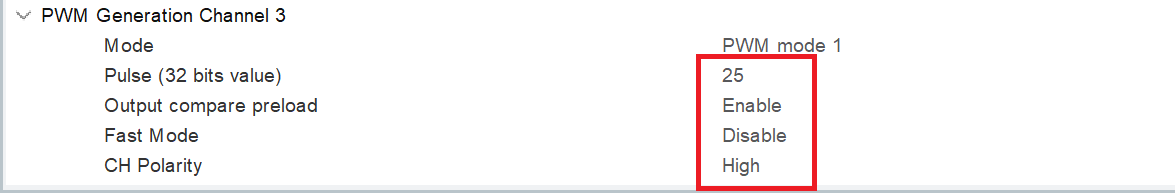 PWM的占空比:Pulse / (counter period+1) = 25/(50-1+1) = 25/50 = 50%