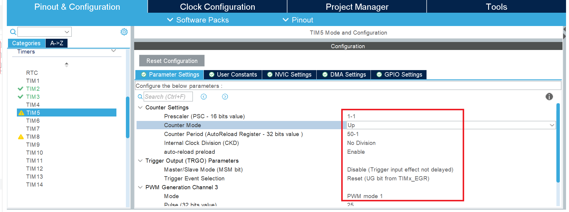 PWM的频率:APB1时钟/(PSC+1)/(counter period+1) = 50MHz/(5-1+1)/(1000000-1+1) = 10Hz