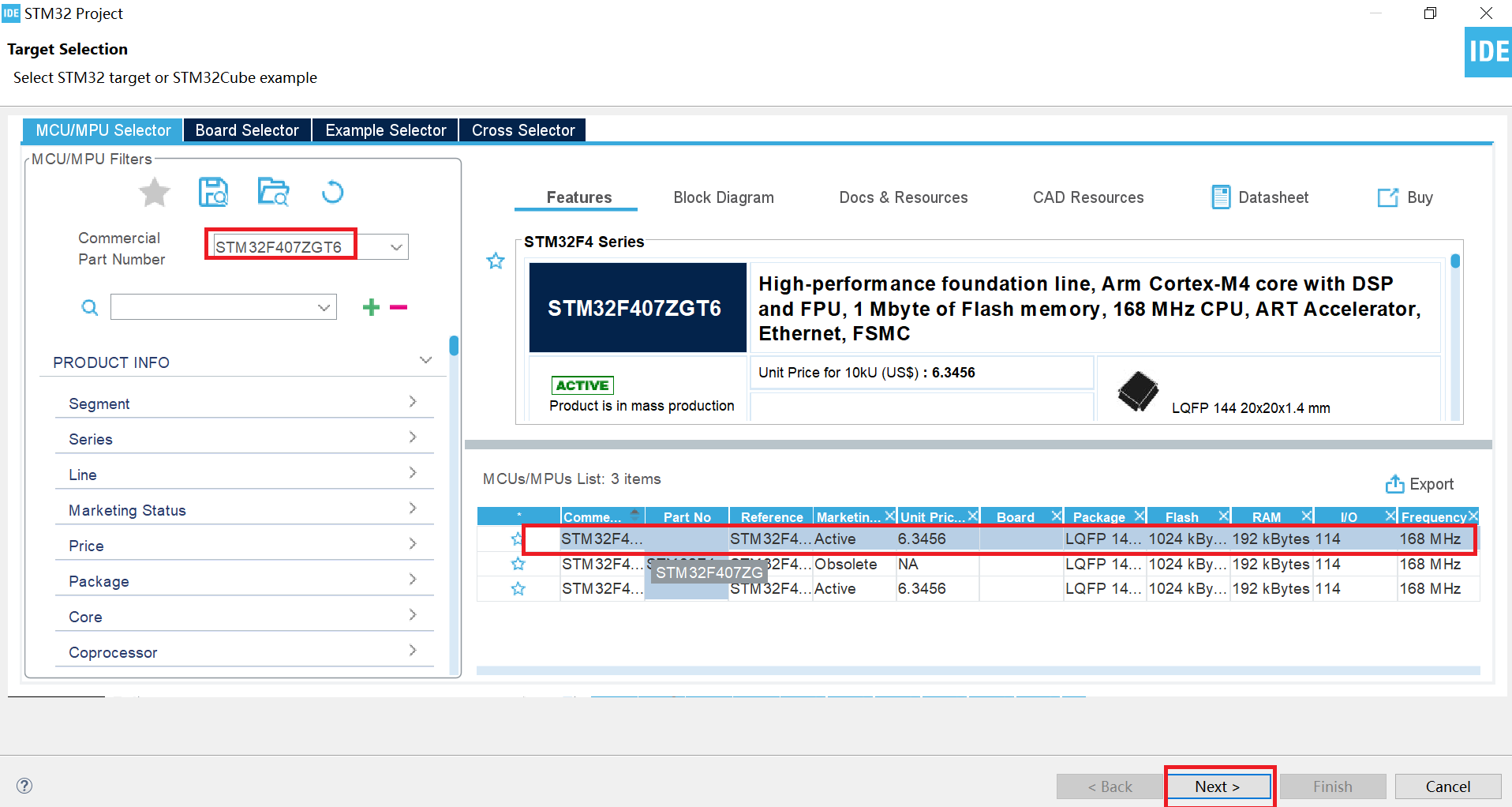 跳出的ioc界面输入芯片型号,选择该芯片,点击【Next】