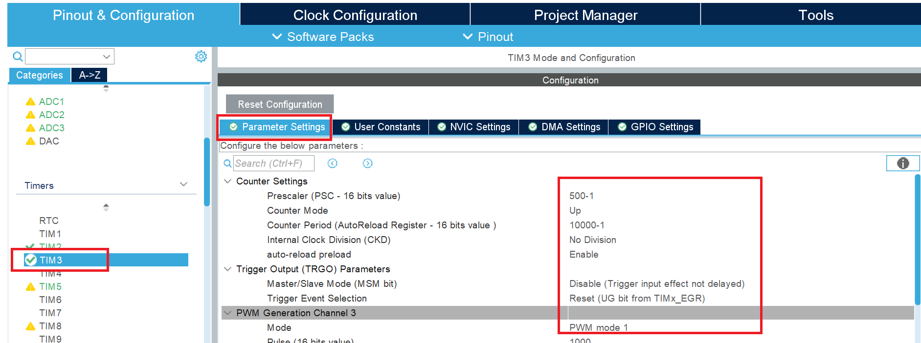 PWM的频率:APB1时钟/(PSC+1)/(counter period+1) = 50MHz/(500-1+1)/(10000-1+1) = 10Hz