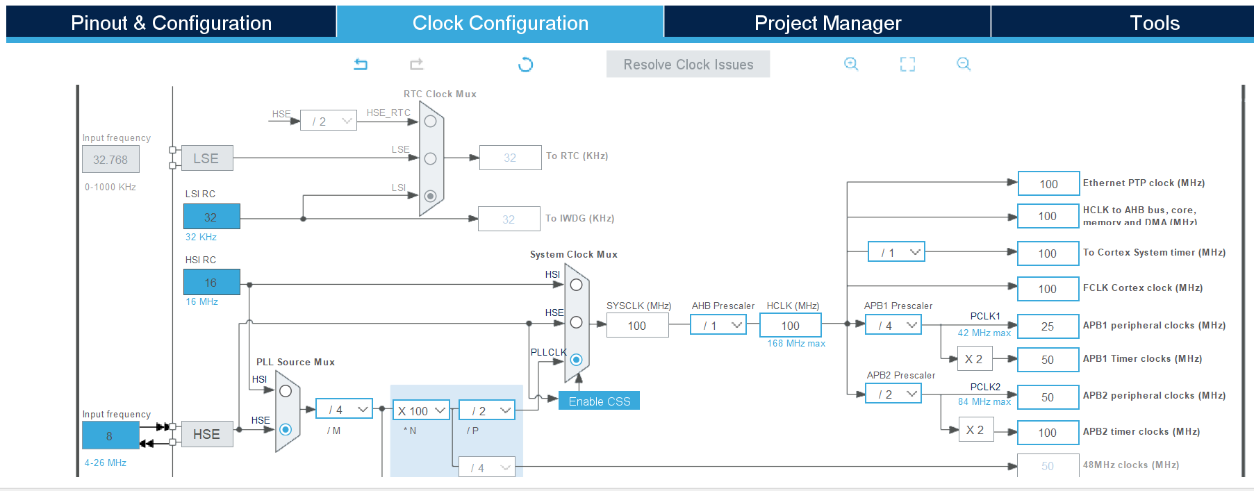 按以下设计,为了后续好计算HCLK设置为100MHz。