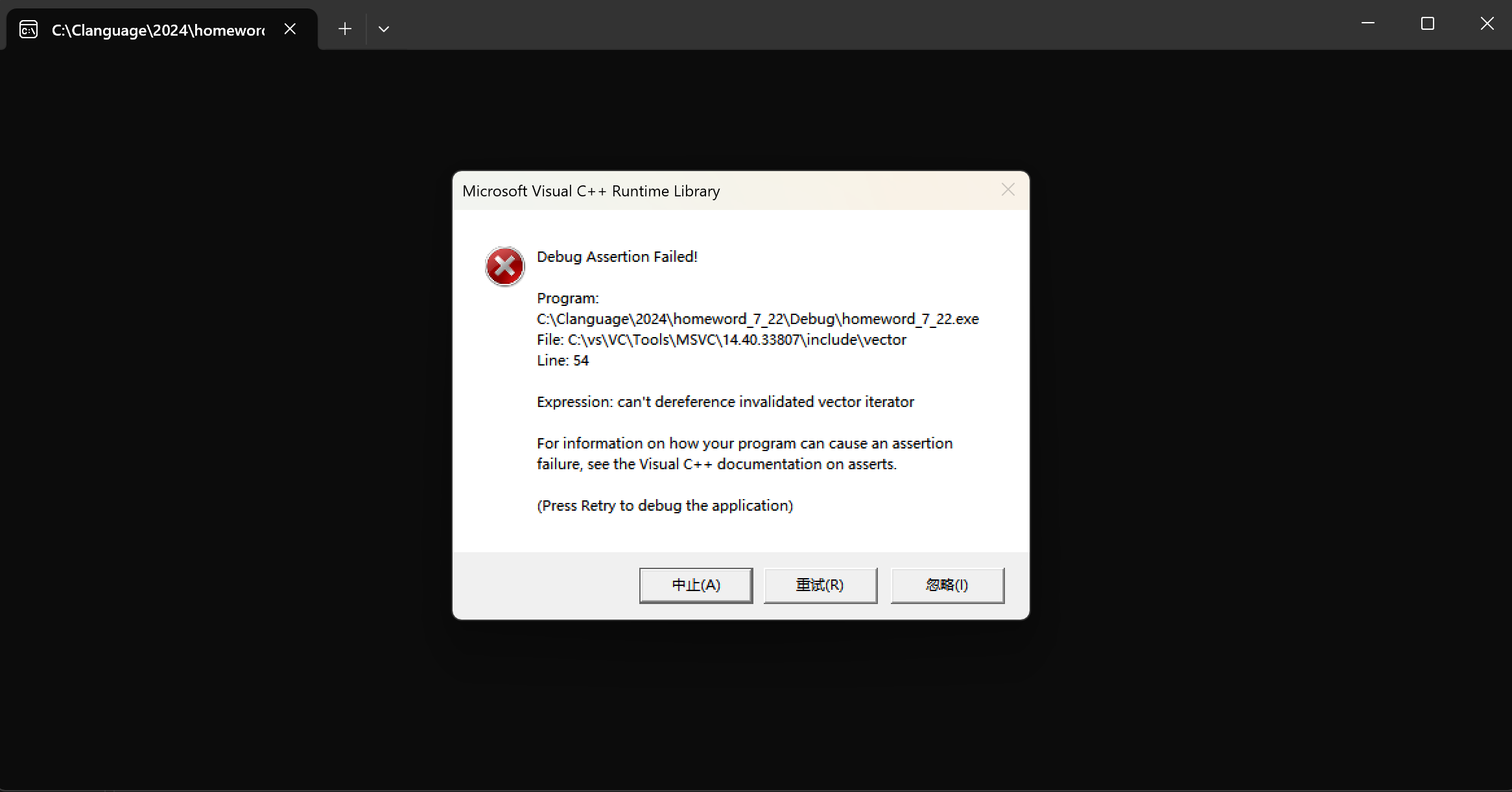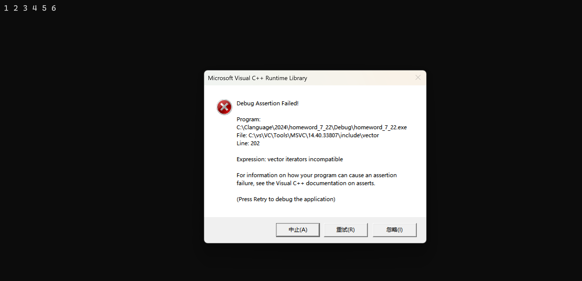 {vector<int> v = {1, 2, 3, 4, 5, 6};//此时迭代器是有效的auto it = v.begin();while (it != v.end()){cout << *it << ' ';++it;}cout << endl;//下面的接口都可能会引起的底层空间扩容,导致迭代器失效//v.push_back(7);//v.insert(v.begin(), 7);//v.reserve(100);//v.assign(100, 7);v.resize(100, 7);//此时迭代器失效了while (it != v.end()){cout << *it << ' ';++it;}cout << endl;return 0;