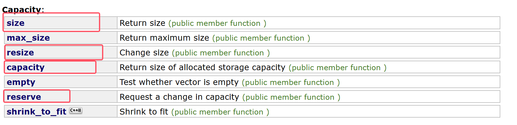 vector 的容量接口与 string 可以说是一模一样,各种接口的名称与功能也都是一样的,这里也就不再赘述。