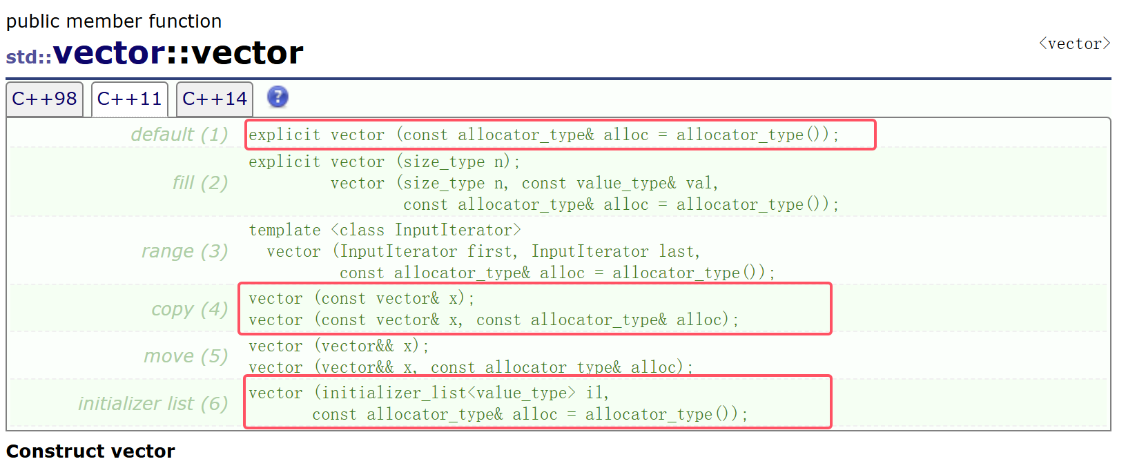 可以看到 vector 的构造函数有很多,其中重点是无参构造,拷贝构造以及使用 initializer_list 构造,这里的 initializer_list 你就可以看成是一个数组。如: