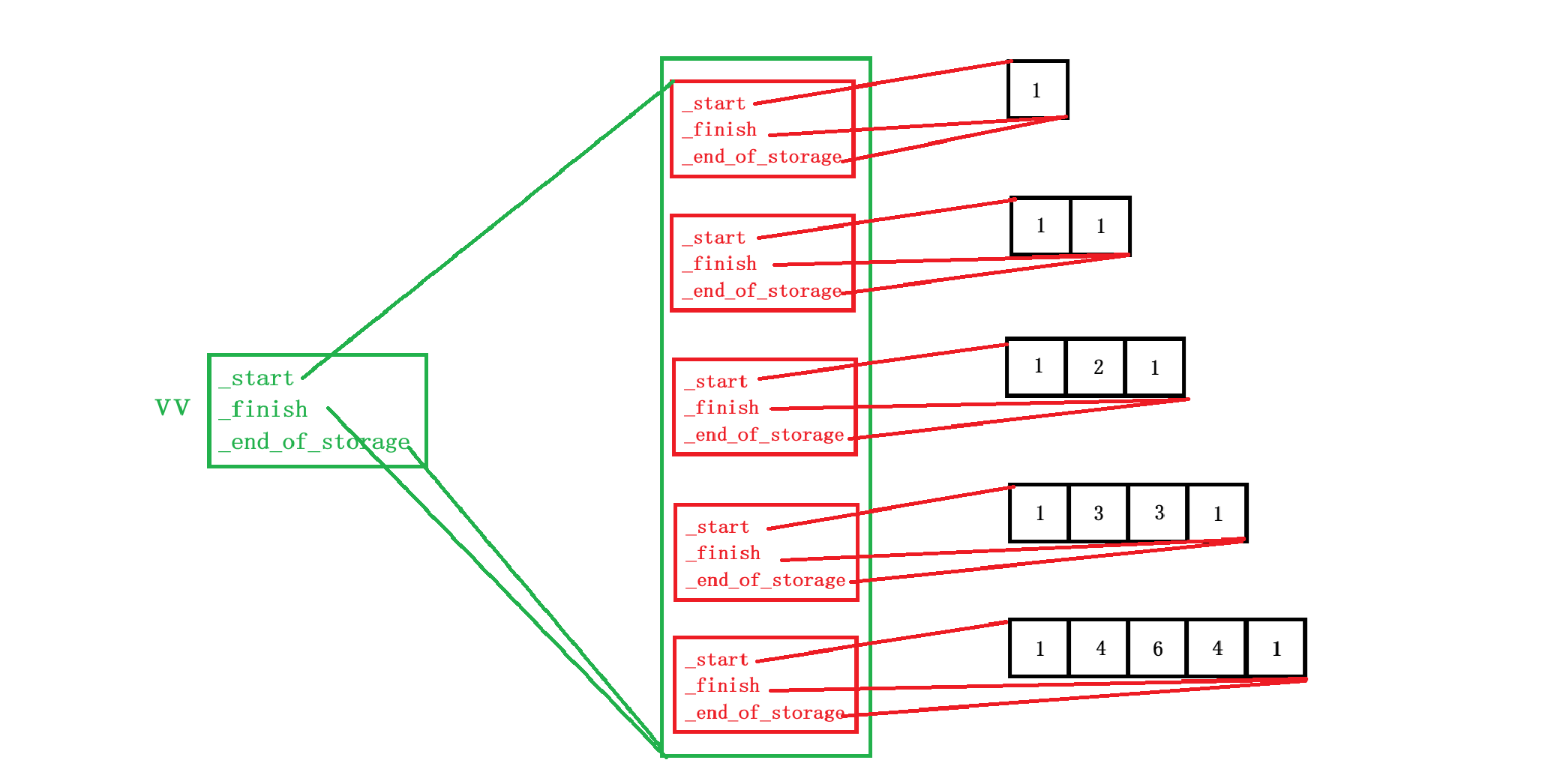 vv[i][j] = vv[i-1][j-1] + vv[i-1][j](i为行数的下标,j为列数的下标,2 <= i < numRows,1 <= j < i)。如果是在 C 语言中,vv[i][j] 其实是指针的解引用,也就是 *(*(vv + i) + j),而在 C++ 中,vv[i][j] 其实是 vv.operator[](i).operator[](j),并且在 C++ 中动态二维数组的结构是这样的: