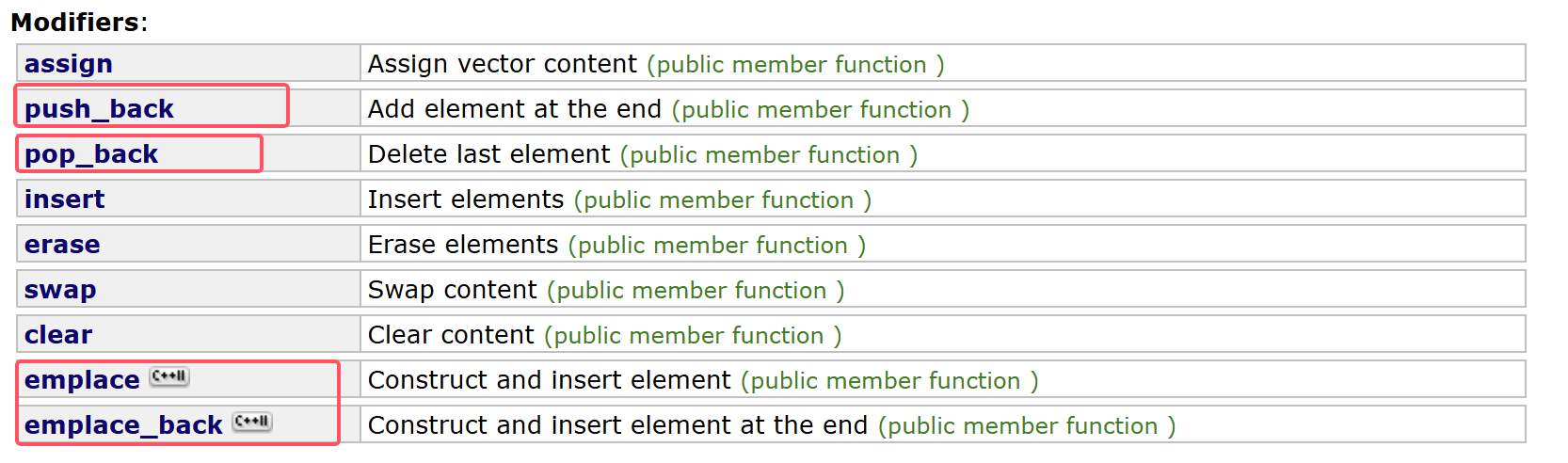 这里的 push_back、pop_back、insert、erase 接口与 string 中的接口也一模一样。注意在 vector 中新增了两个接口 emplace 与 emplace_back: