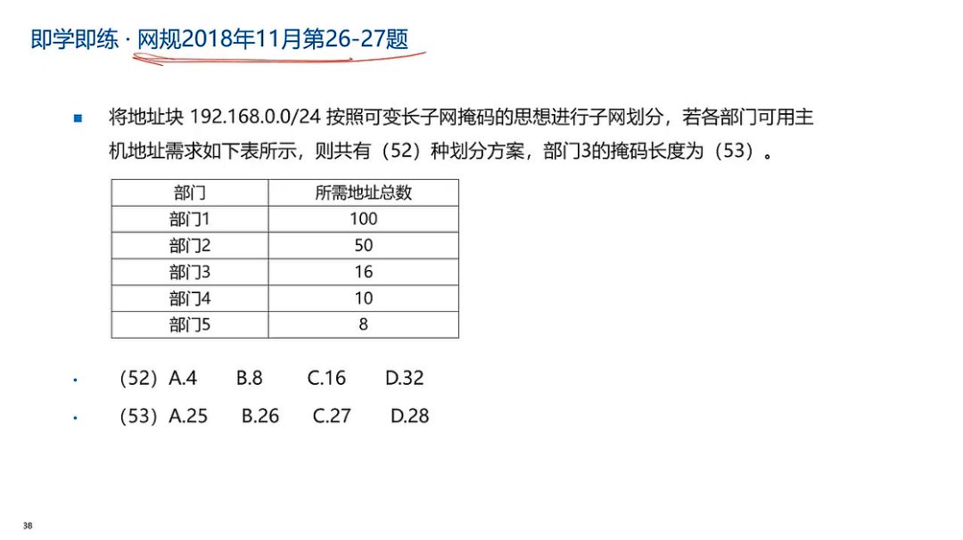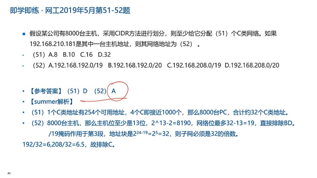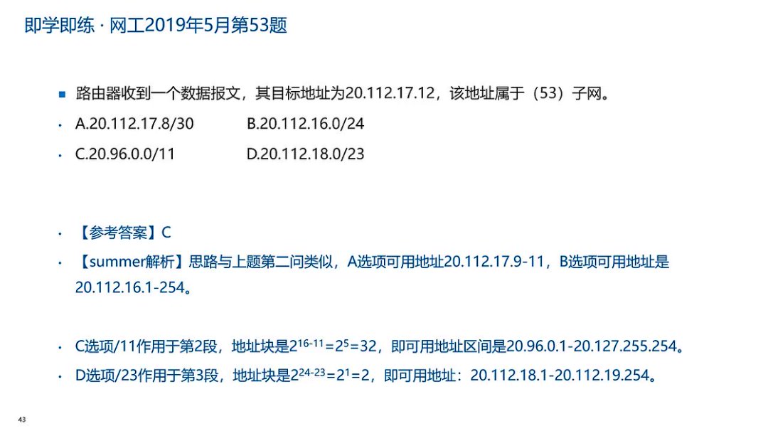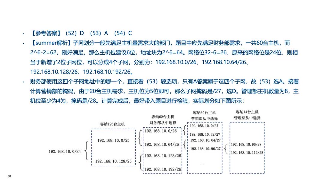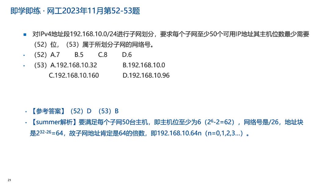 解题技巧 | 1. 背熟2^n次方表 2. 优先处理大需求 3. 注意边界地址 | 网关地址不占用主机数 | ★★★ |