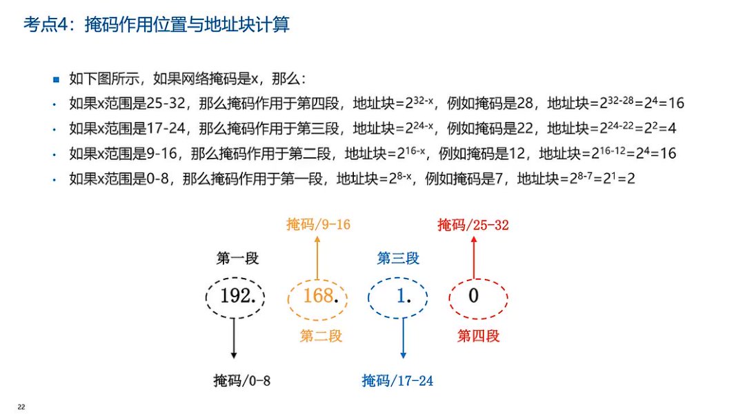 地址块计算 | 地址块=2^主机位次方,子网为地址块整数倍 | 作用于不同网段的掩码范围(17-24位动第三段) | ★★★★ |