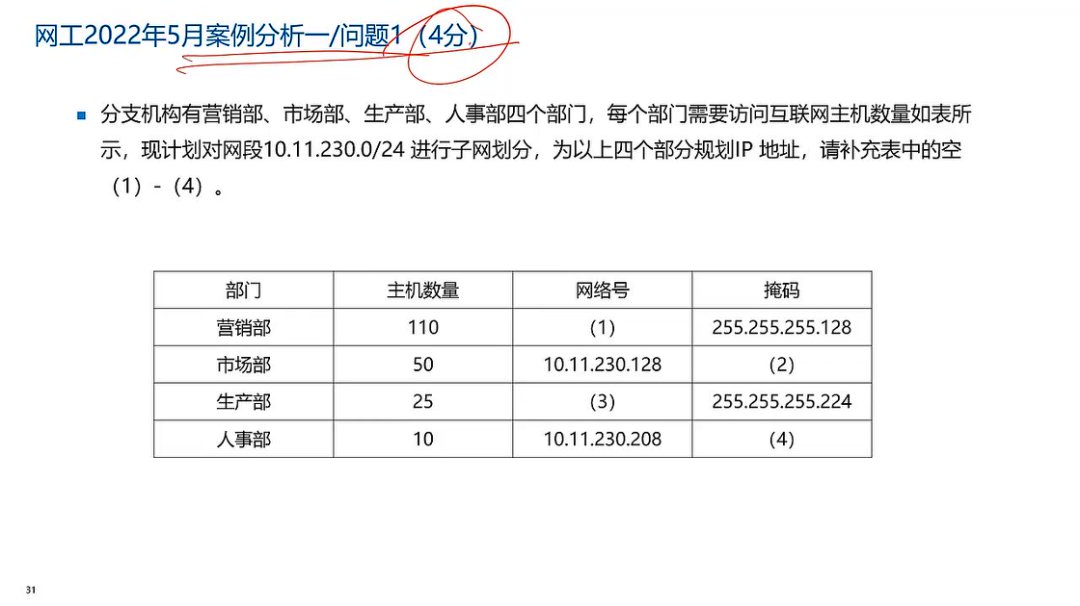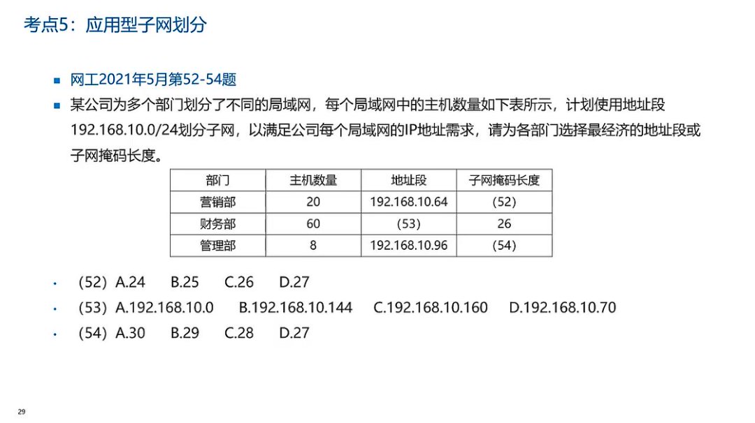 典型考题类型 | 1. 已知子网数量求掩码 2. 已知主机数求掩码 3. 判断IP所属子网 | 中高级考试分值差异(中级10分/高级3分) | ★★★★ |