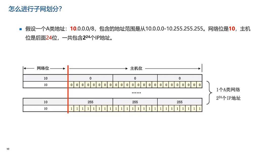 - 地址结构分析:以A类地址10.0.0.0/8为例,网络位是"10"(8位),主机位是后24位,包含2^24个IP地址(从10.0.0.0到10.255.255.255)。